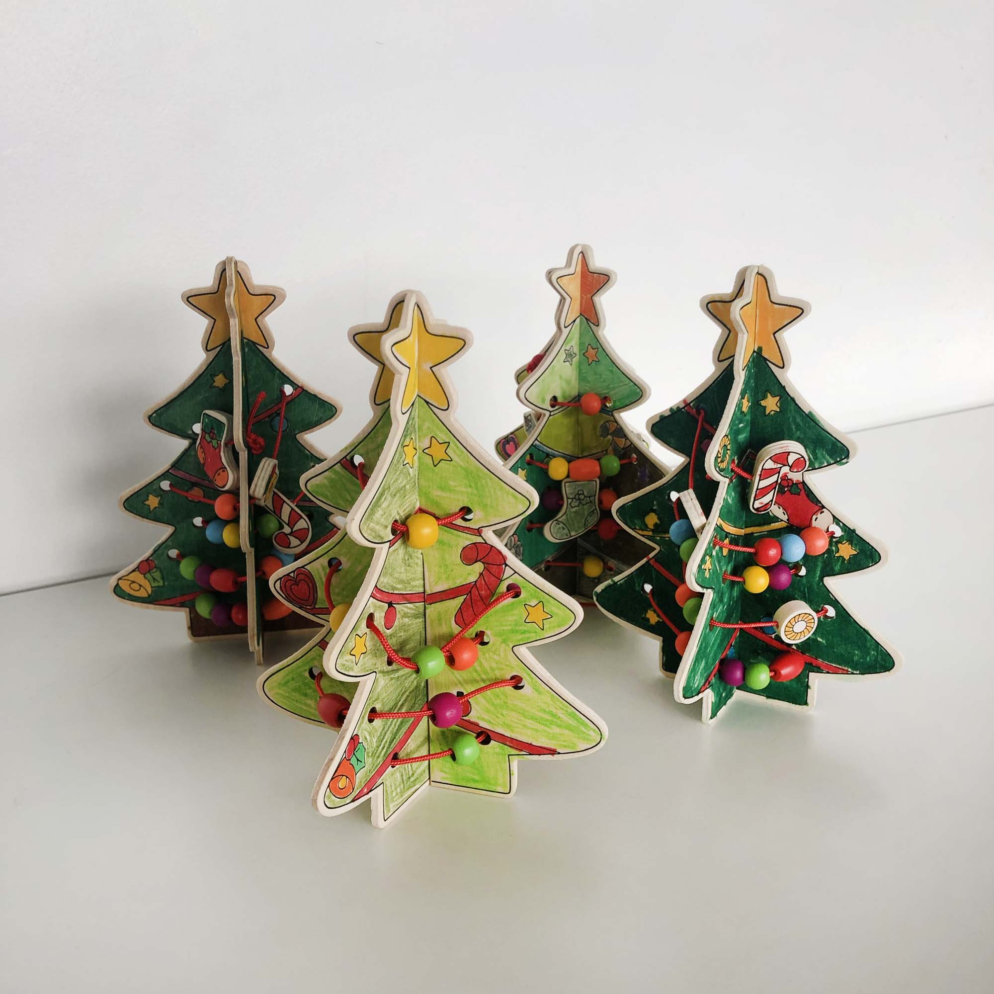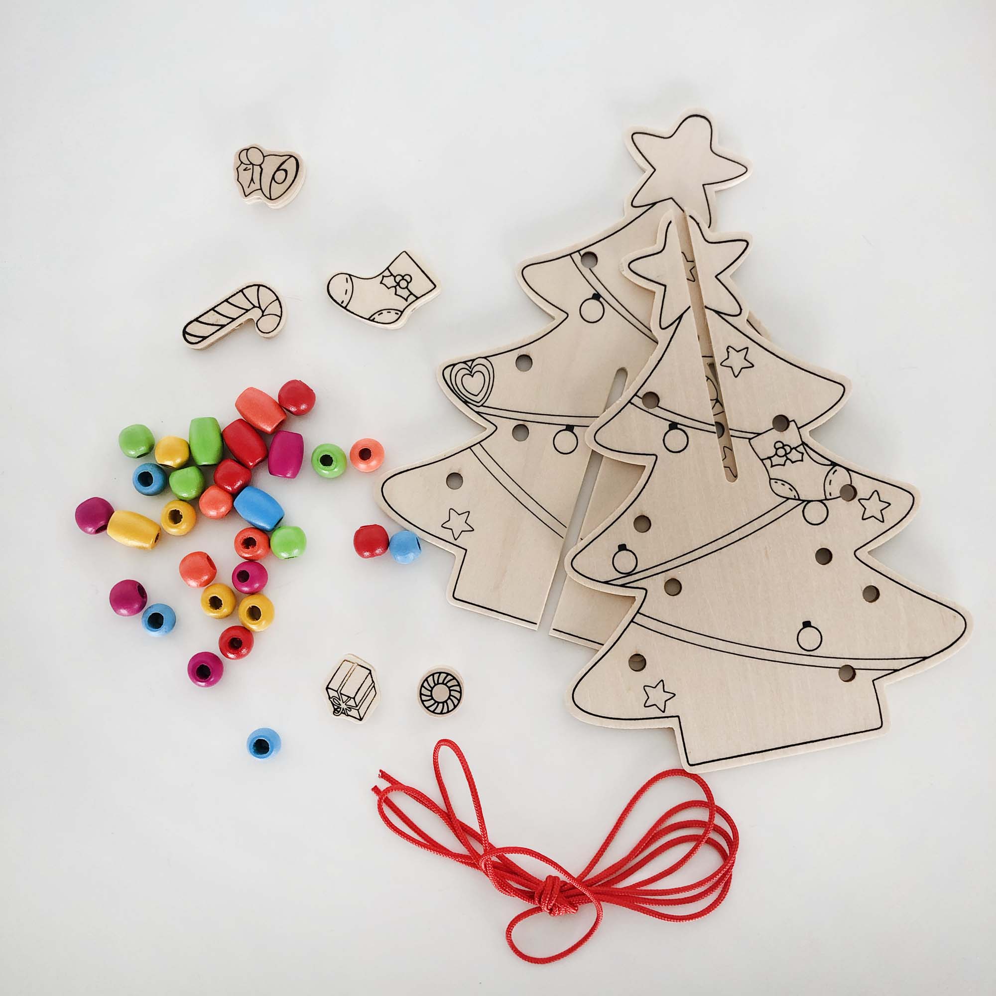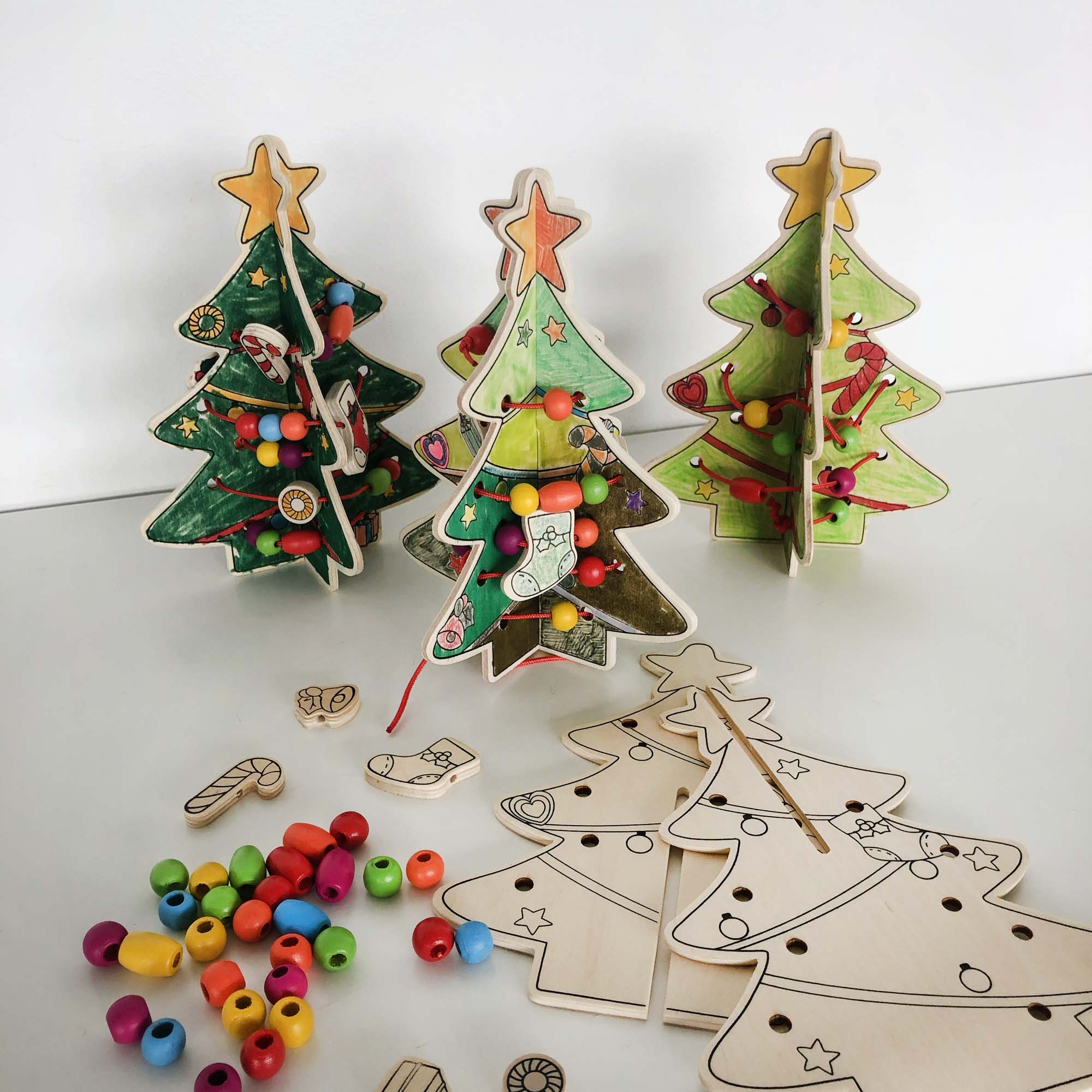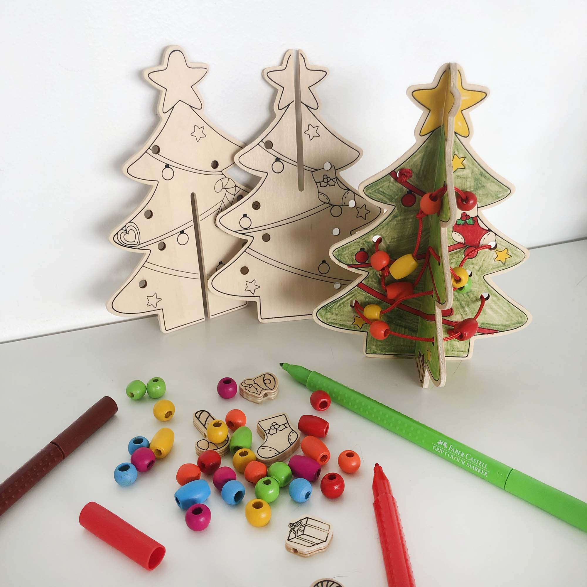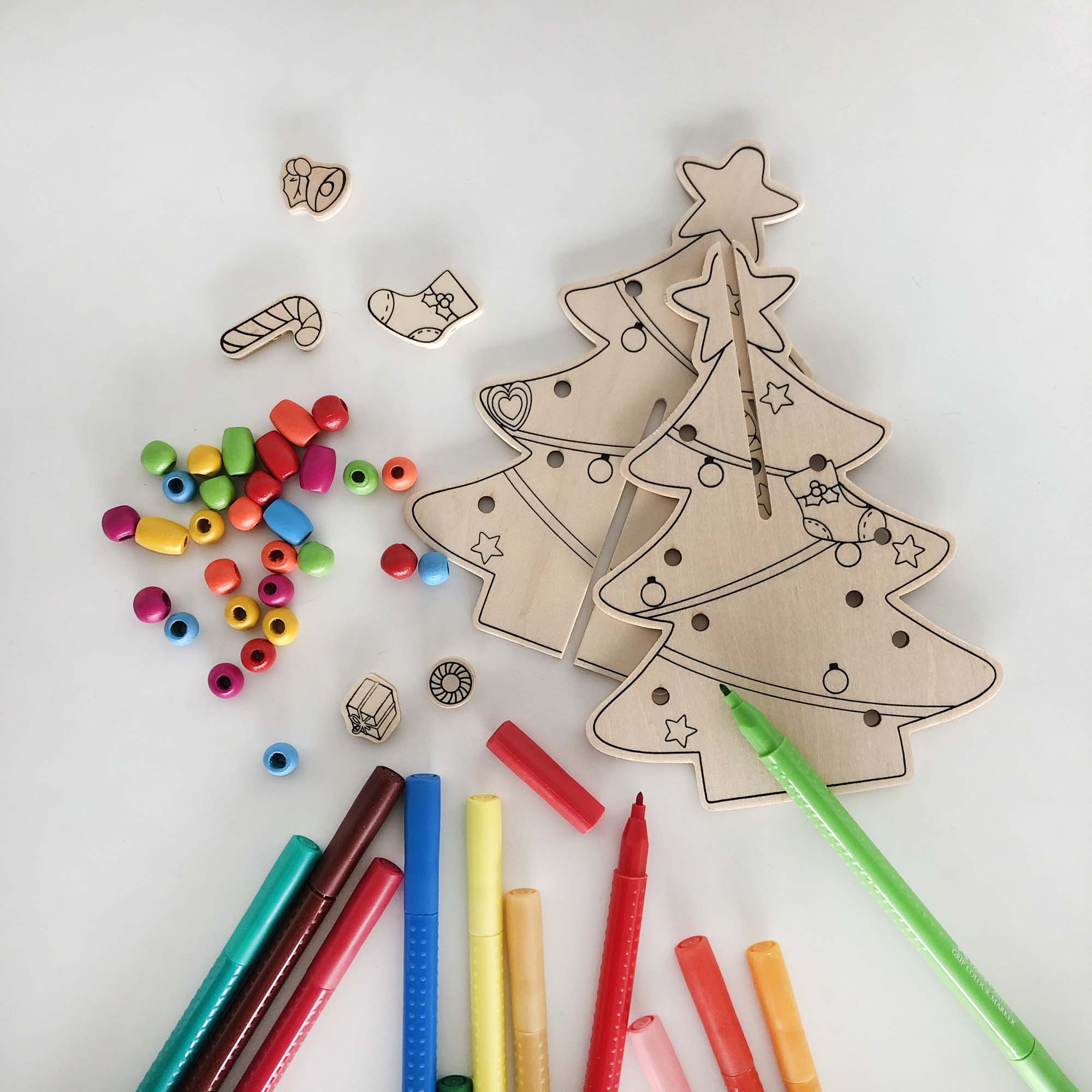 Contiene tutto il necessario per poterlo decorare (filo, perline e accessori in legno) ed è possibile utilizzare pennarelli, matite o pastelli per colorarlo.