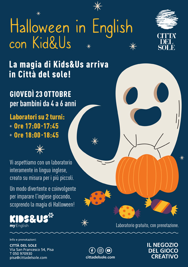 Vi aspettiamo con un laboratorio interamente in lingua inglese, creato su misura per i più piccoli. Un modo divertente e coinvolgente per imparare l’inglese giocando, scoprendo la magia di Halloween.