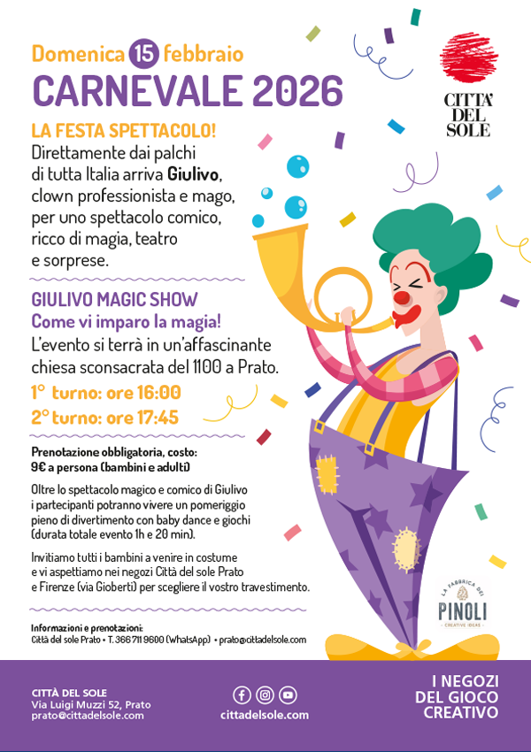 Oltre lo spettacolo magico e comico di Giulivo i partecipanti potranno vivere un pomeriggio pieno di divertimento con baby dance e giochi (durata totale evento 1h e 20 min). Invitiamo tutti i bambini a venire in costume e vi aspettiamo nei negozi Città del sole Prato e Firenze (via Gioberti) per scegliere il vostro travestimento.
