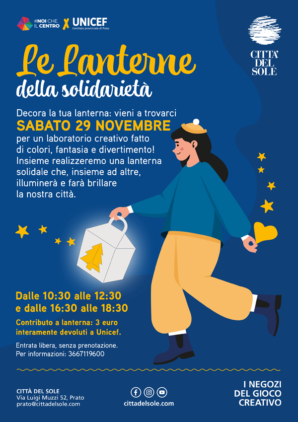 Decora la tua lanterna: vieni a trovarci per un laboratorio creativo fatto di colori, fantasia e divertimento! Insieme realizzeremo una lanterna solidale che, insieme ad altre, illuminerà e farà brillare della nostra città.