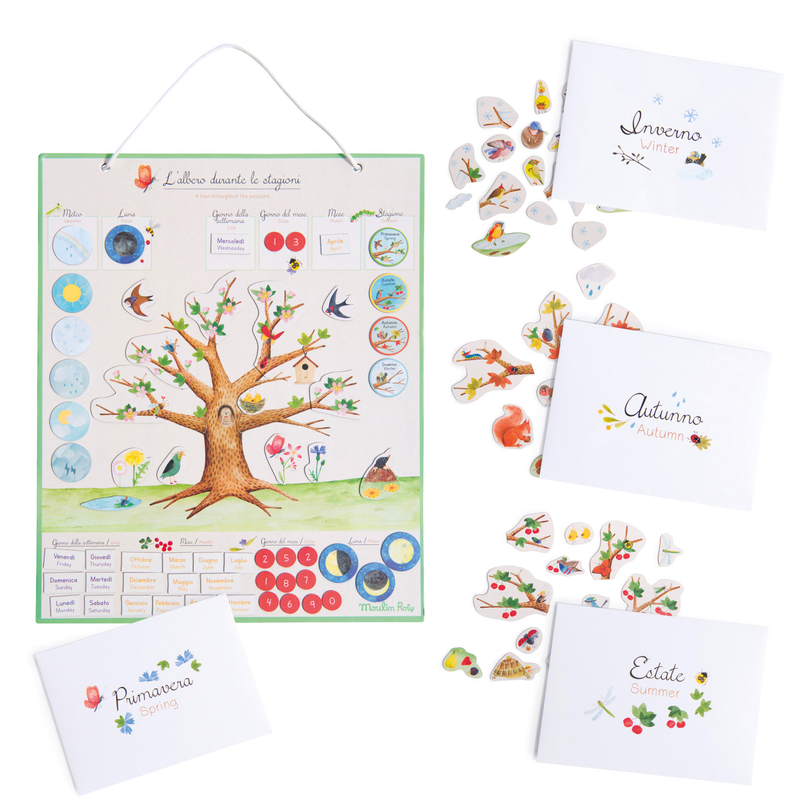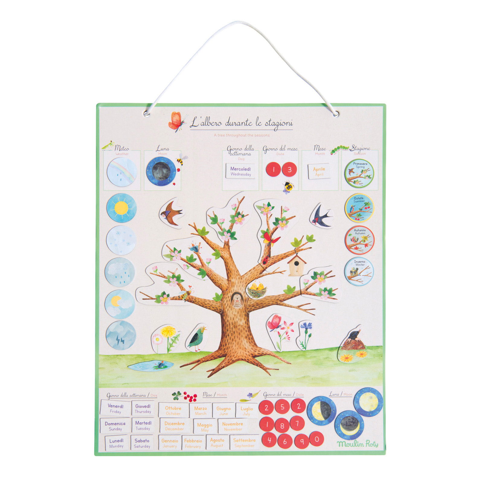 Un grande albero che, grazie ai magneti finemente illustrati, nel corso dell'anno metterà fiori e frutti, perderà le foglie e accoglierà la neve. Con 108 magneti illustrati, che includono i giorni della settimana, la data, il mese, le stagioni, ma anche le indicazioni meteorologiche, le diverse fasi lunari e i magneti di animali e frutti di stagione divisi in 4 bustine per riporre ogni stagione. Per scoprire fin da piccoli il passare del tempo e l'avvicendarsi dei mesi. Misura cm 39x48.
