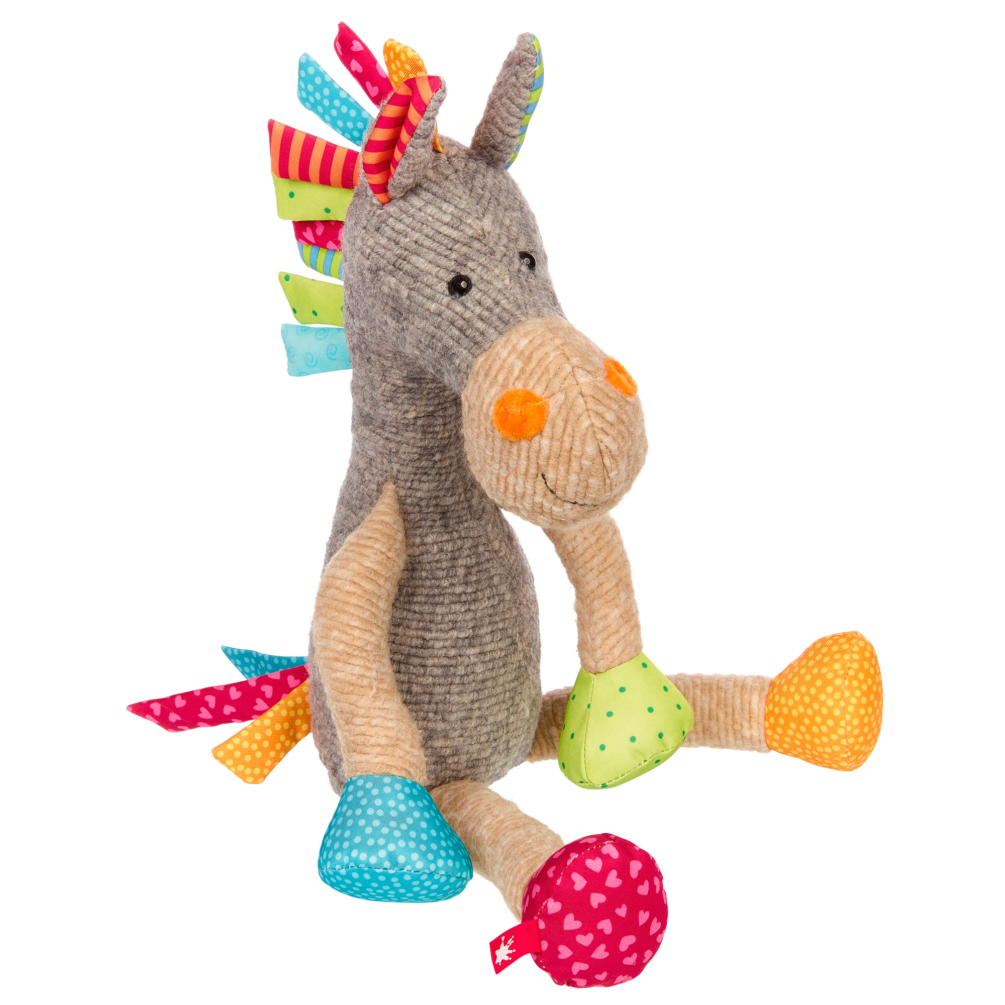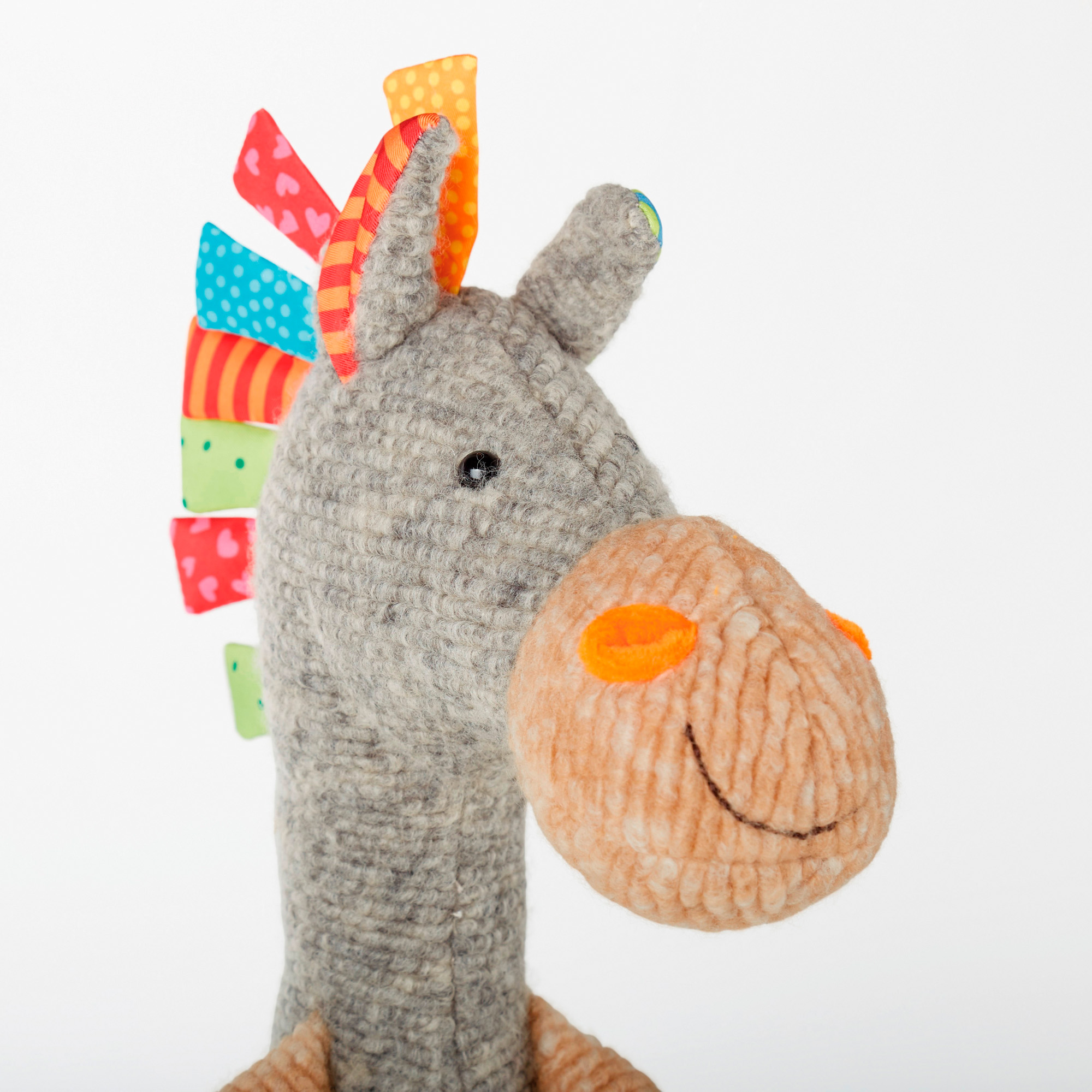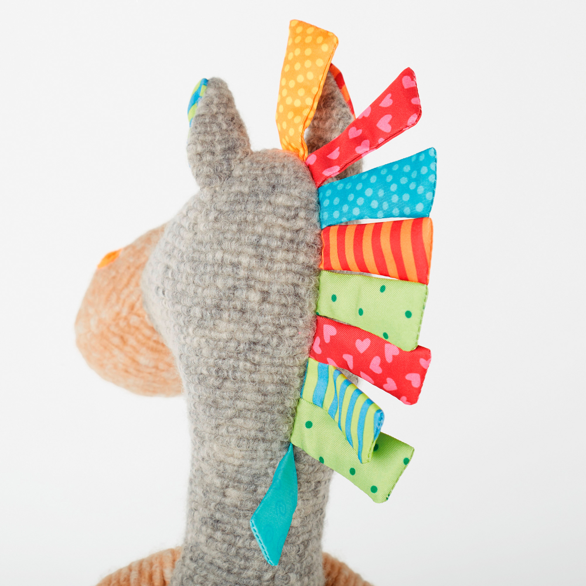 Un cavallo patchwork colorato, con diverse texture e arti morbidi abbracciabili per stimolare i sensi del bambino e calmarlo. In piedi misura 47 x 22 x 21 cm. Continua