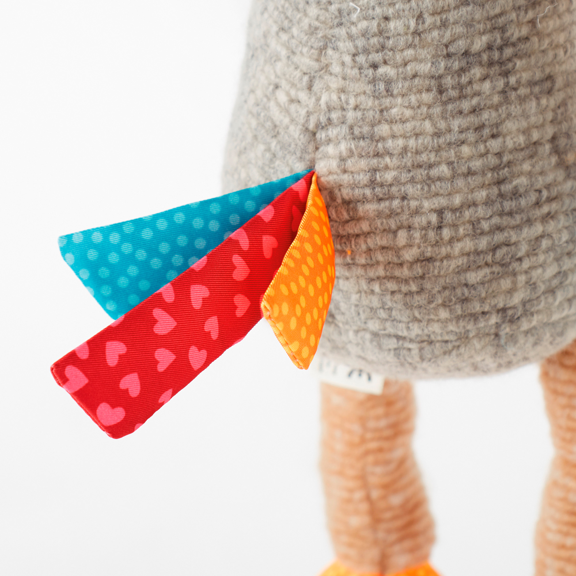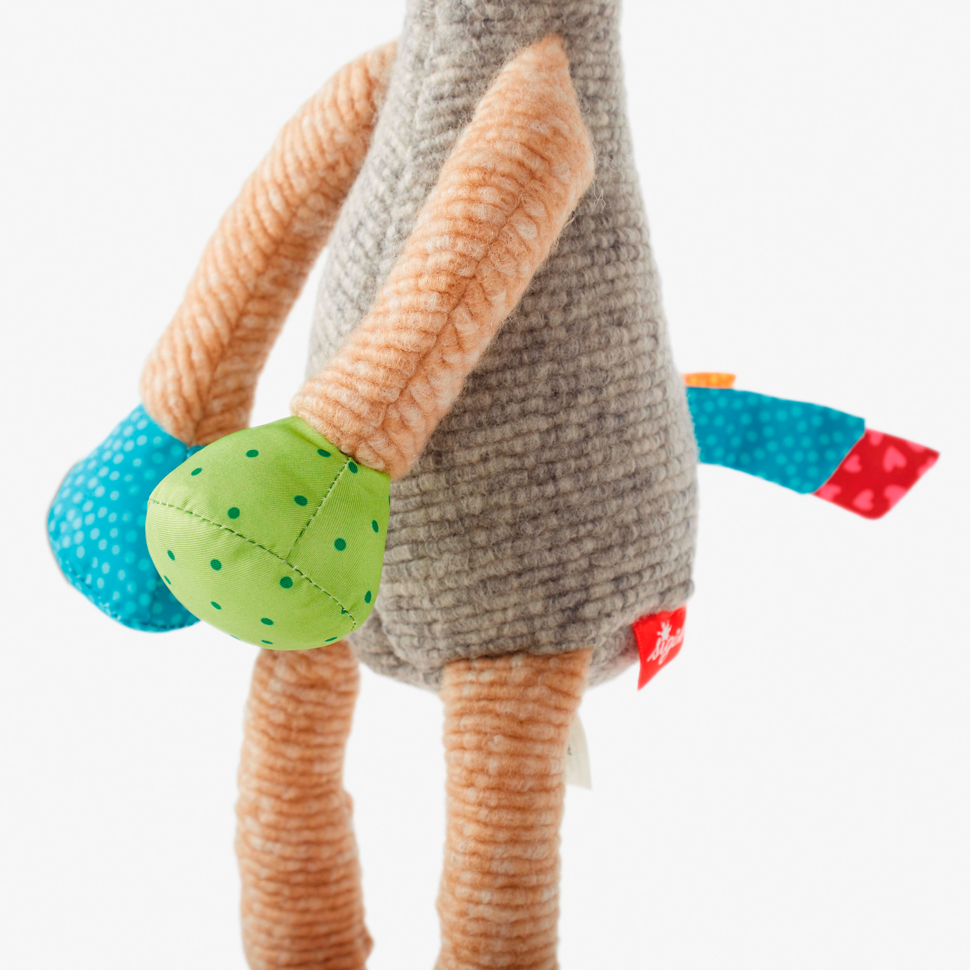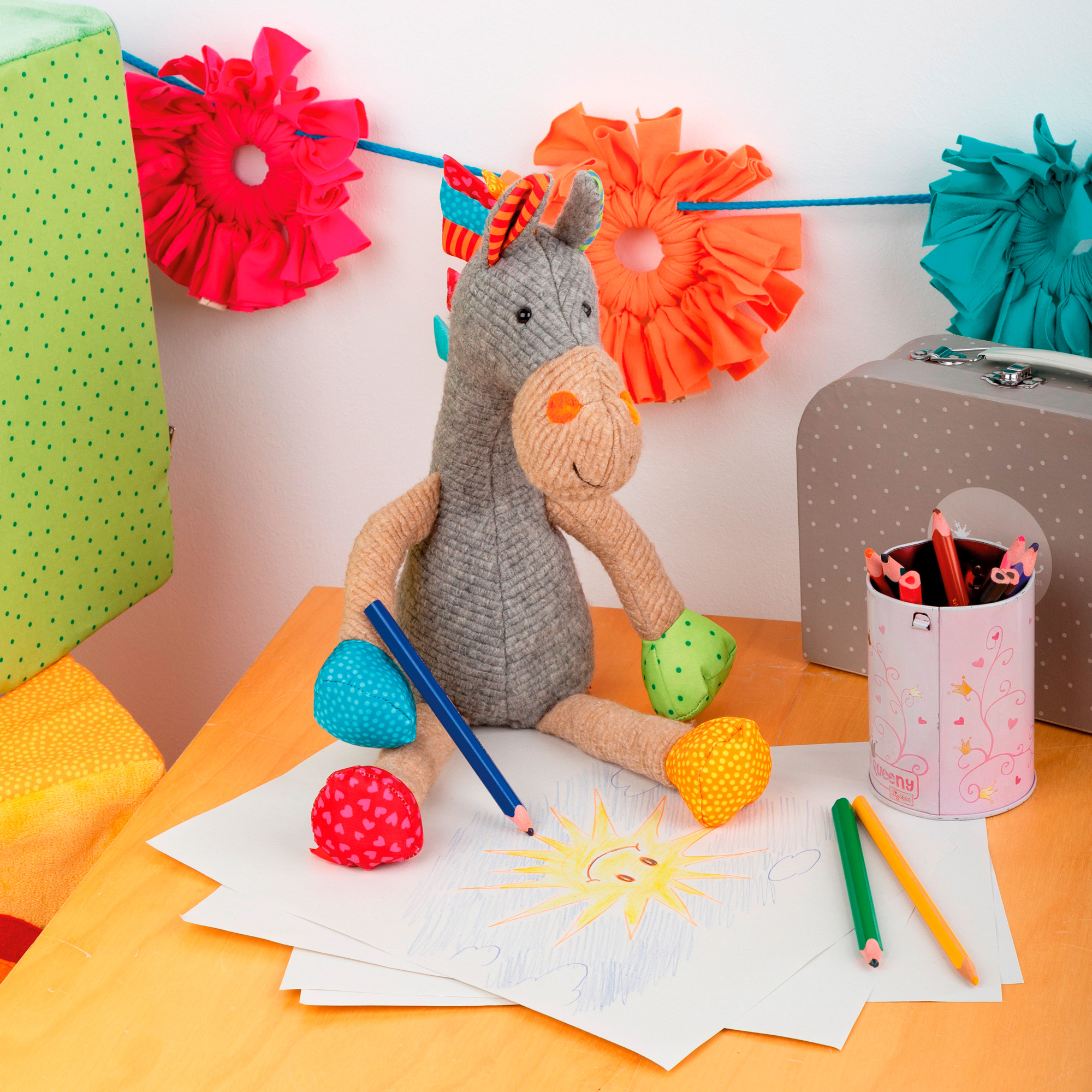 Un cavallo patchwork colorato, con diverse texture e arti morbidi abbracciabili per stimolare i sensi del bambino e calmarlo. In piedi misura 47 x 22 x 21 cm. Continua