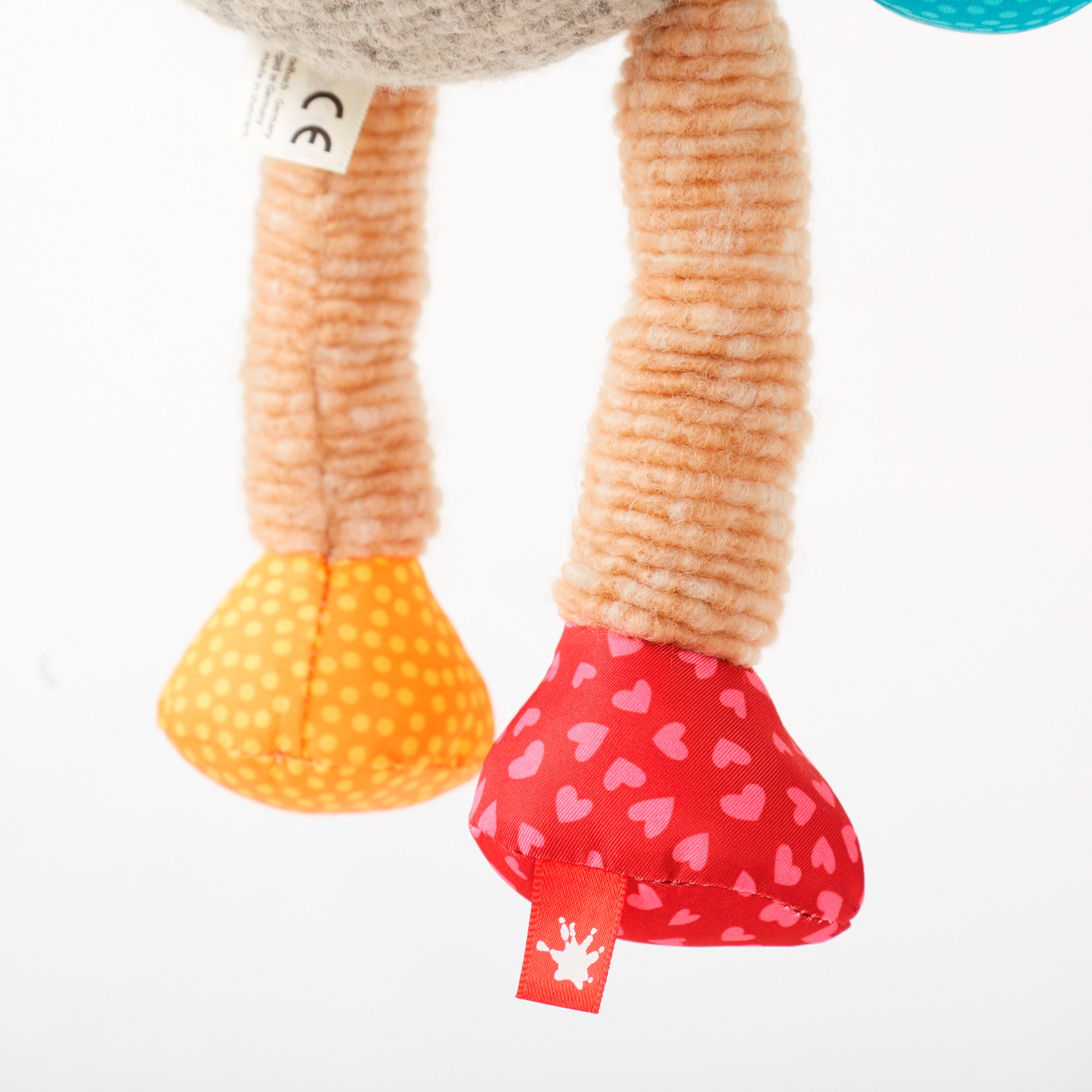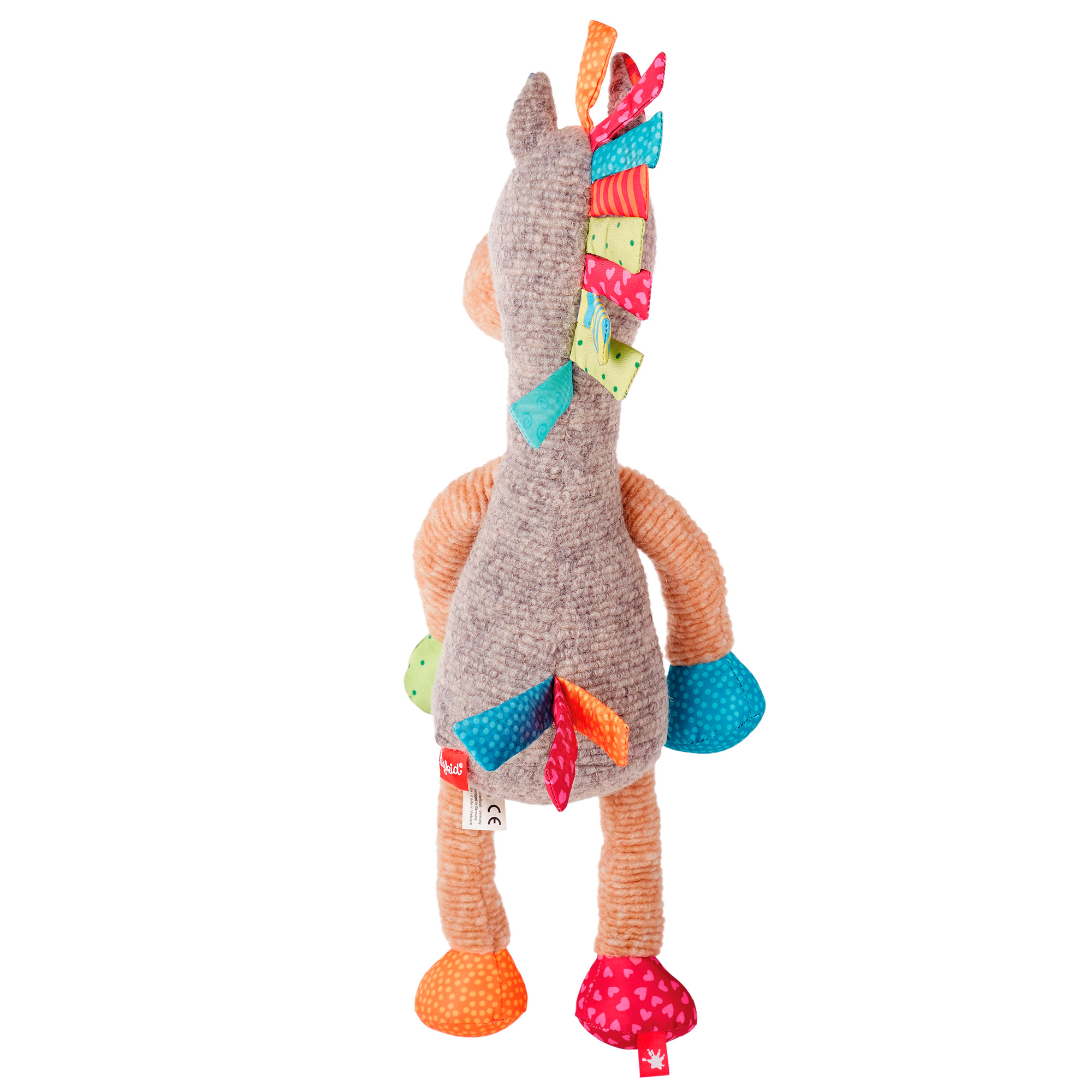 Un cavallo patchwork colorato, con diverse texture e arti morbidi abbracciabili per stimolare i sensi del bambino e calmarlo. In piedi misura 47 x 22 x 21 cm.