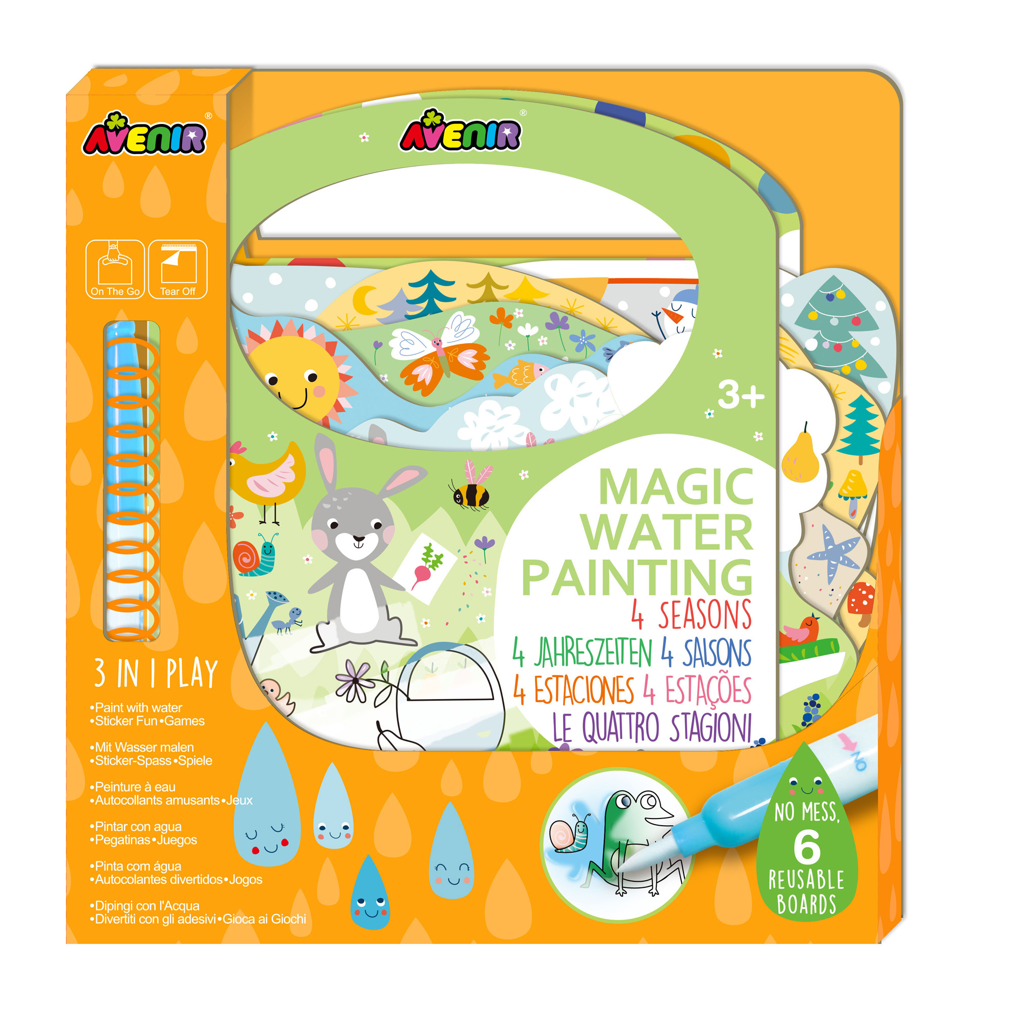 Il modo più semplice per portarsi ovunque un kit per dipingere, senza paura di sporcare, è quello di...disegnare con l'acqua! Ogni blocco è formato da pagine con superfici da colorare, riutilizzabili più e più volte. Sarà sufficiente riempire con acqua il serbatoio della penna inclusa e passare il pennello sul foglio per far comparire magicamente i colori sulle pagine. Man mano che l'acqua si ascuga, i colori scompaiono. Il blocco include anche pagine di adesivi e attività enigmistiche come il labirinto o il cerca e trova. Dimensione del blocco cm 21 x 22.