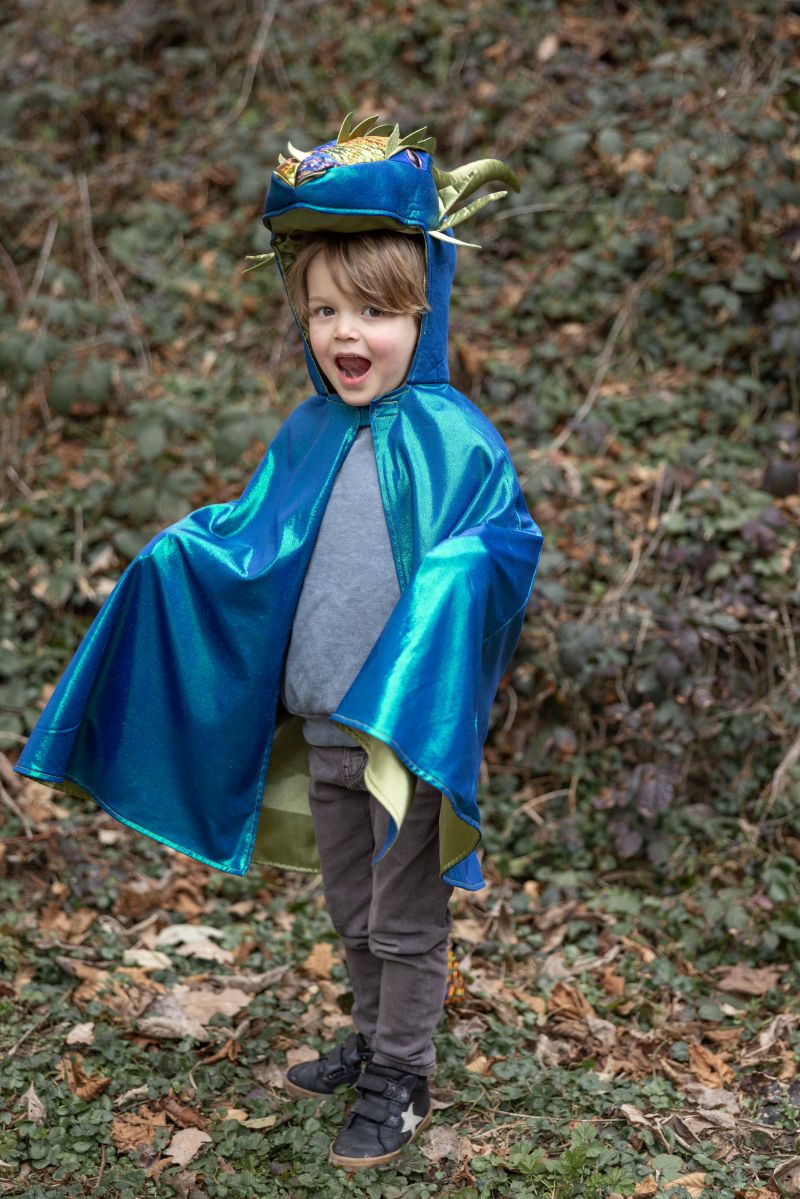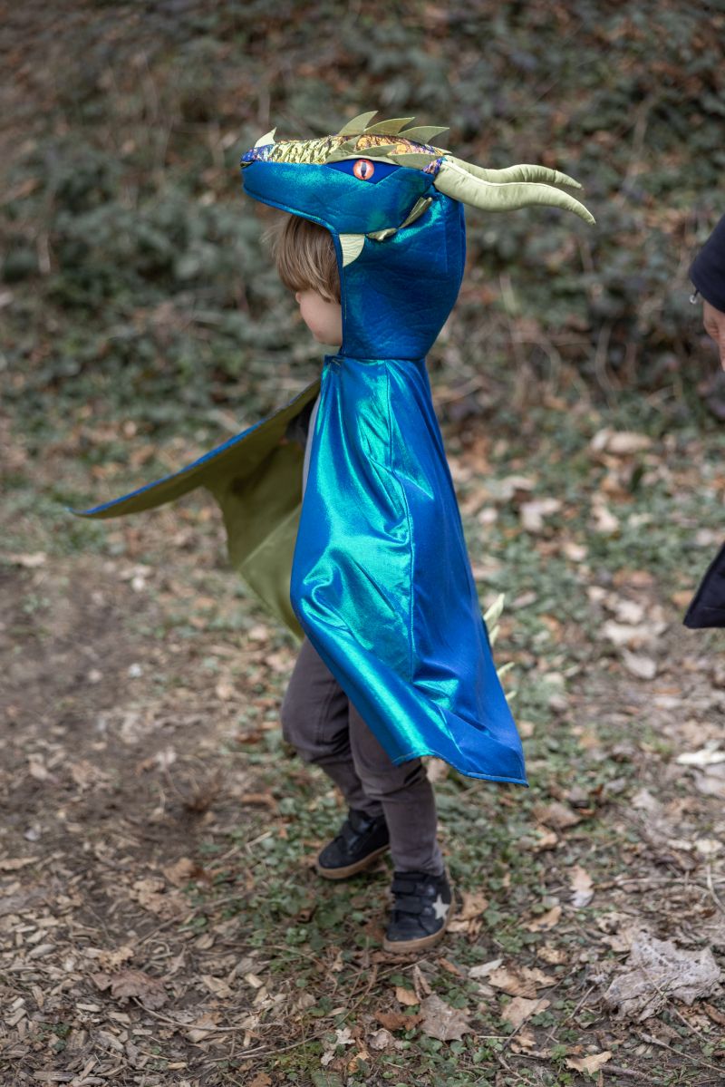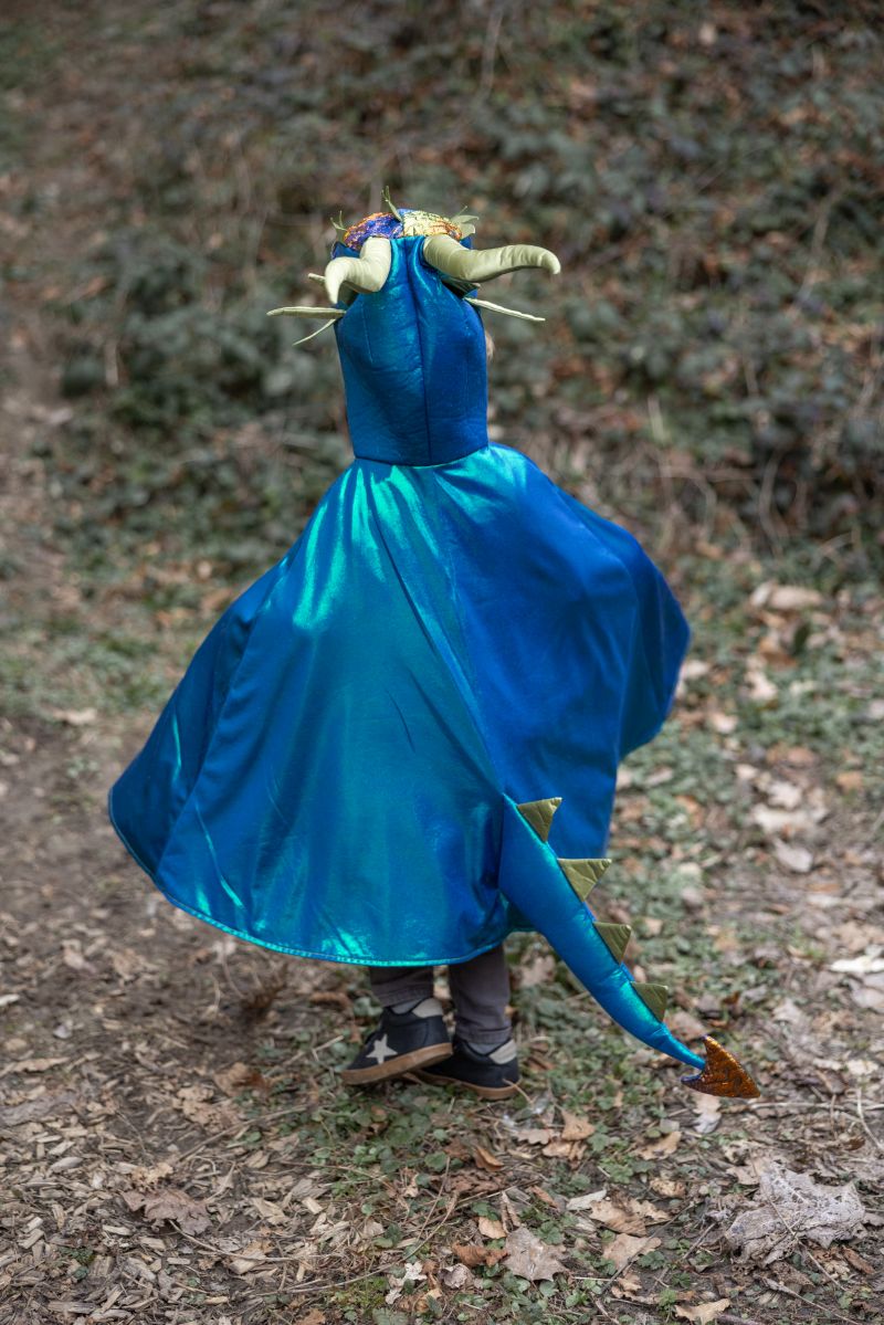 Questo mantello da Drago è davvero sontuoso, con il suo vivace tessuto blu smeraldo metallizzato e la ricca fodera in raso verde. Le intricate squame di drago e la coda epica aggiungono un tocco magico e incantato. Il mantello presenta anche un maestoso cappuccio, completo di vivaci corna verdi e muso, che trasforma ogni bambino in una creatura mitica pronta ad affrontare qualsiasi avventura. Questo mantello non è solo un accessorio, è la porta magica per infinite avventure e una creatività senza limiti.