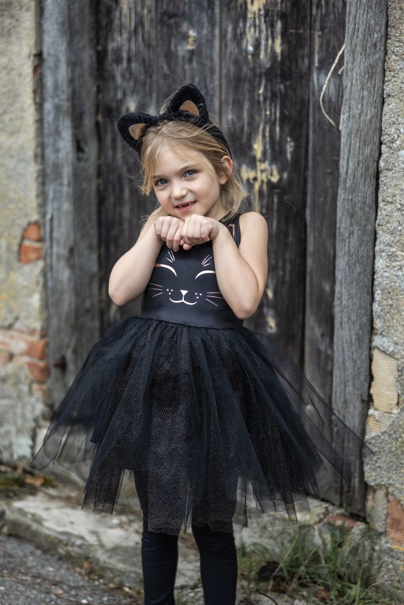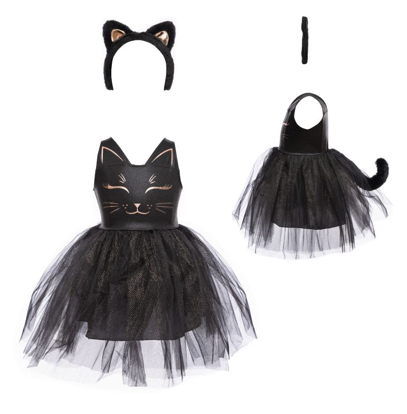 Il completo perfetto per tutte le bimbe appassionate di felini. L'abito ha un elegante corpetto nero impreziosito da un musetto di gatto stampato in oro rosa e una scintillante gonna a brillantini dorati. Non manca neppure la coda per un effetto giocoso e un cerchietto con morbide orecchie da gatto pelose.