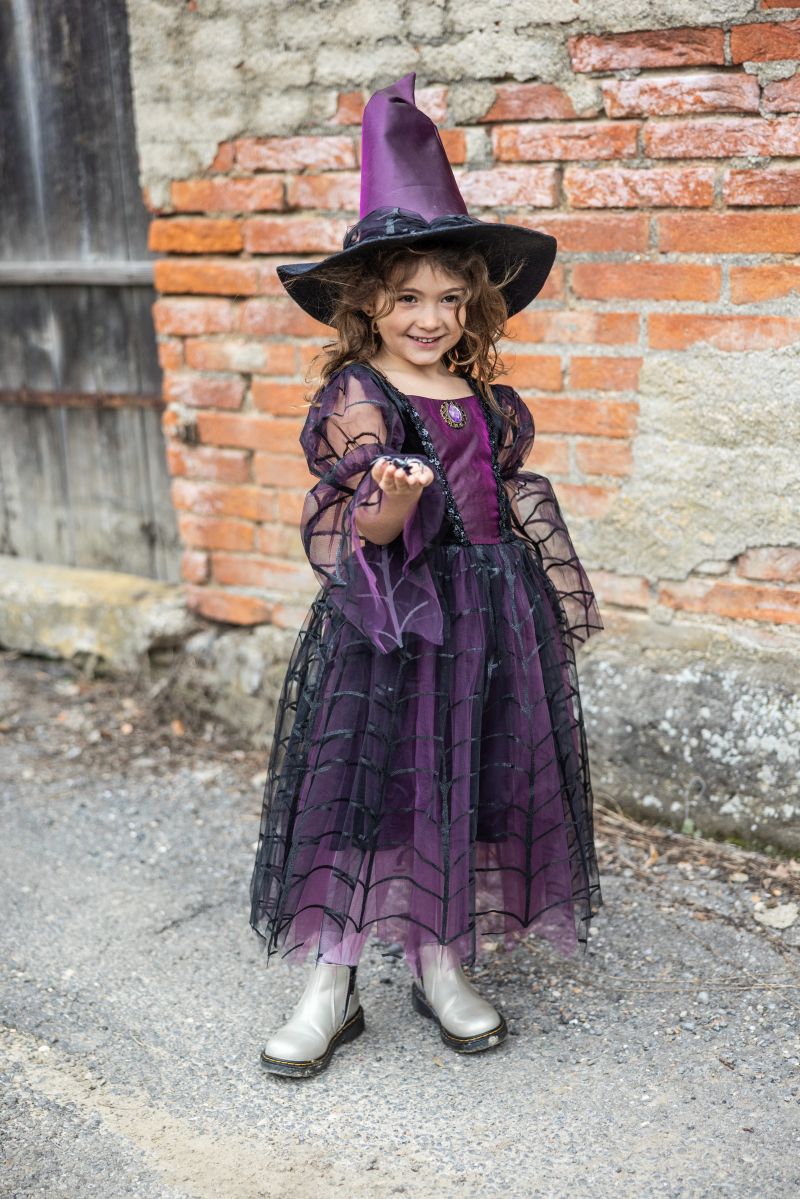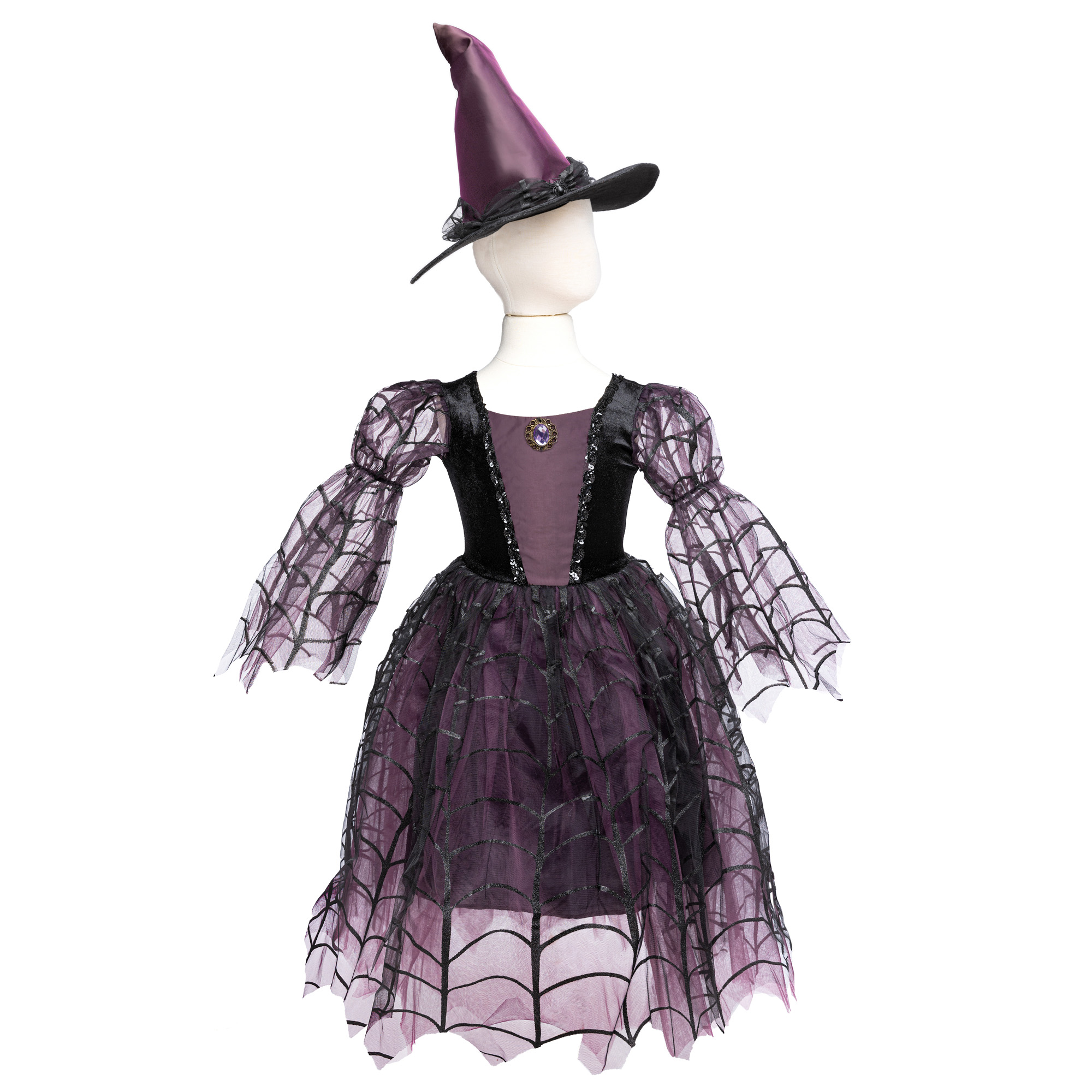 Un sontuoso ed elaborato costume da strega con cappello. Di color ametista, è realizzato con numerosi dettagli e adornato da brillanti motivi a ragnatela che lo rendono luminoso. La gonna è vaporosa e il cappello a punta, bordato da sinistri motivi a ragno, è decorato con un fiore e un originale cammeo.