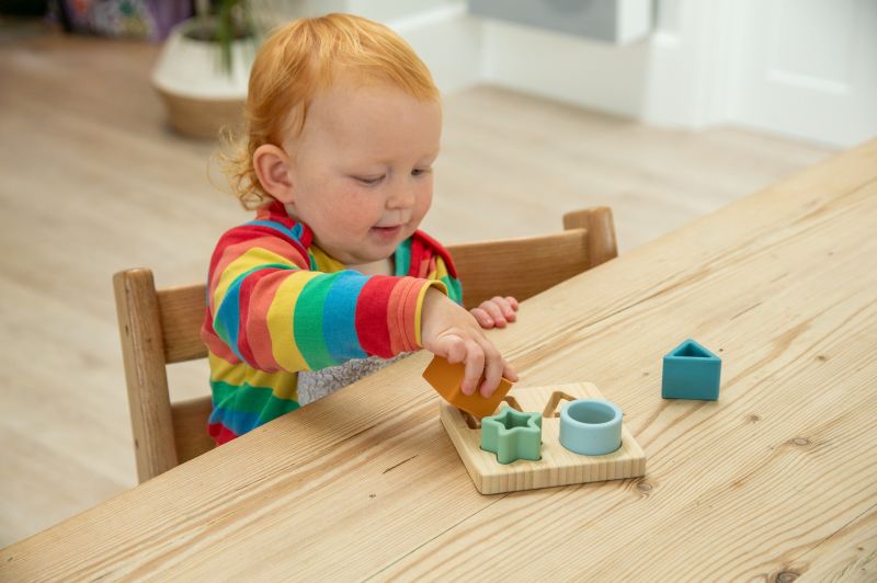 Un semplice gioco delle forme con base in bambù. Le forme sono in silicone e possono essere utilizzate anche come formine con la plastilina. I bambini più grandi possono anche giocare a riempire le scanalature nella tavola con piccole perline o riso, come attività di concentrazione sensoriale. Realizzato in silicone alimentare, lavabile in lavastoviglie, e bambù.