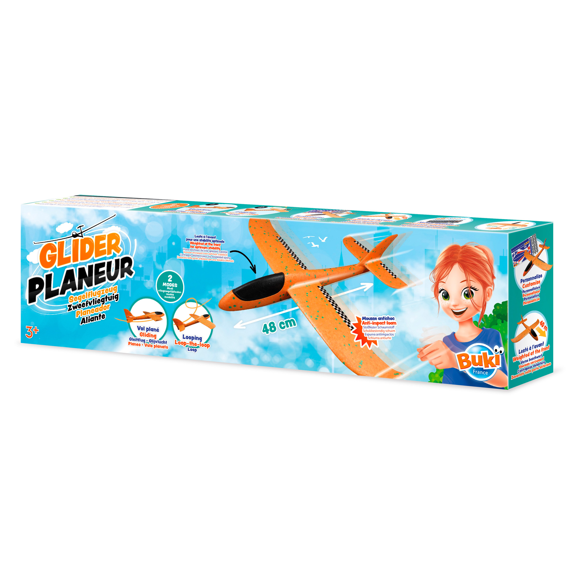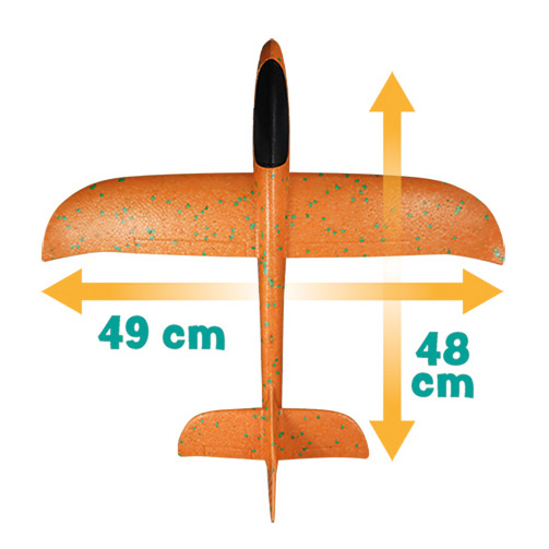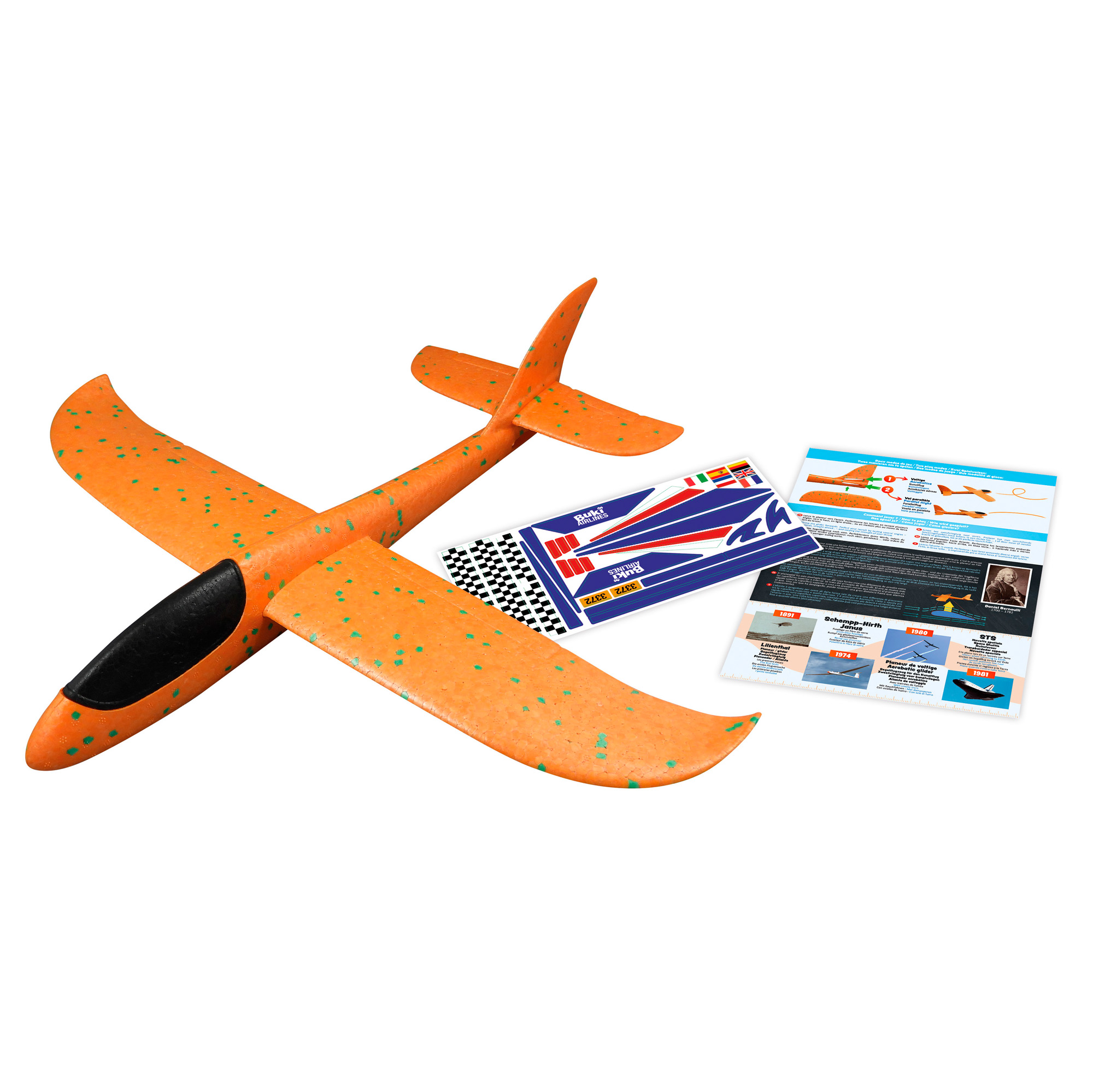 Un grande aliante da assemblare, lungo 48 cm, leggero e resistente, adatto per lunghi voli. Cambiando la posizione del piano di coda si può eseguire il looping. E' personalizzabile con gli adesivi inclusi e misura cm 48x49. Include: libretto illustrato con spiegazioni scientifiche.