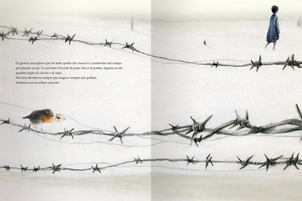 Il piccolo pettirosso deciderà di portare con sé questa nuova amica dal nastro azzurro tra i capelli, perché la Shoah e i campi di concentramento sono cosa troppo crudele per una bambina.