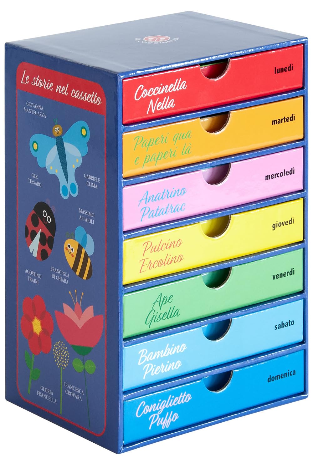 Una collezione di 7 storie scritte e illustrate da autori italiani scelti nel panorama della letteratura infantile di qualità. Un’originale e colorata mini-cassettiera in robusto cartone ecologico, con sette scomparti per scegliere ogni giorno della settimana un libro diverso.