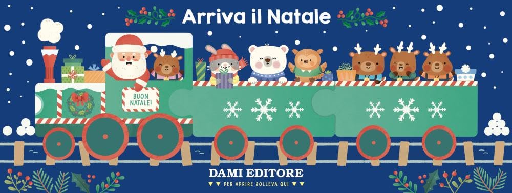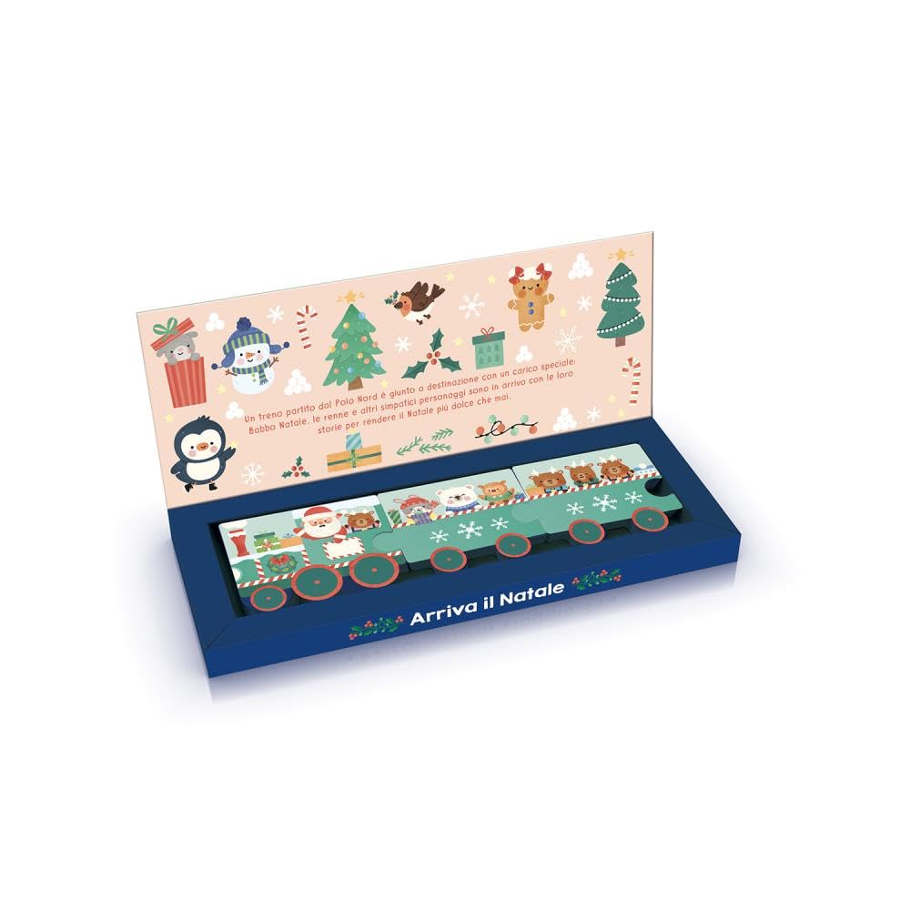Per le prime letture sotto l'albero, contenuti in una pratica valigetta, tre libriccini cartonati e sagomati a forma di tessere di puzzle si incastrano e formano un trenino carico di amici in partenza dal Polo Nord. Ogni libro racconta una semplice avventura natalizia.