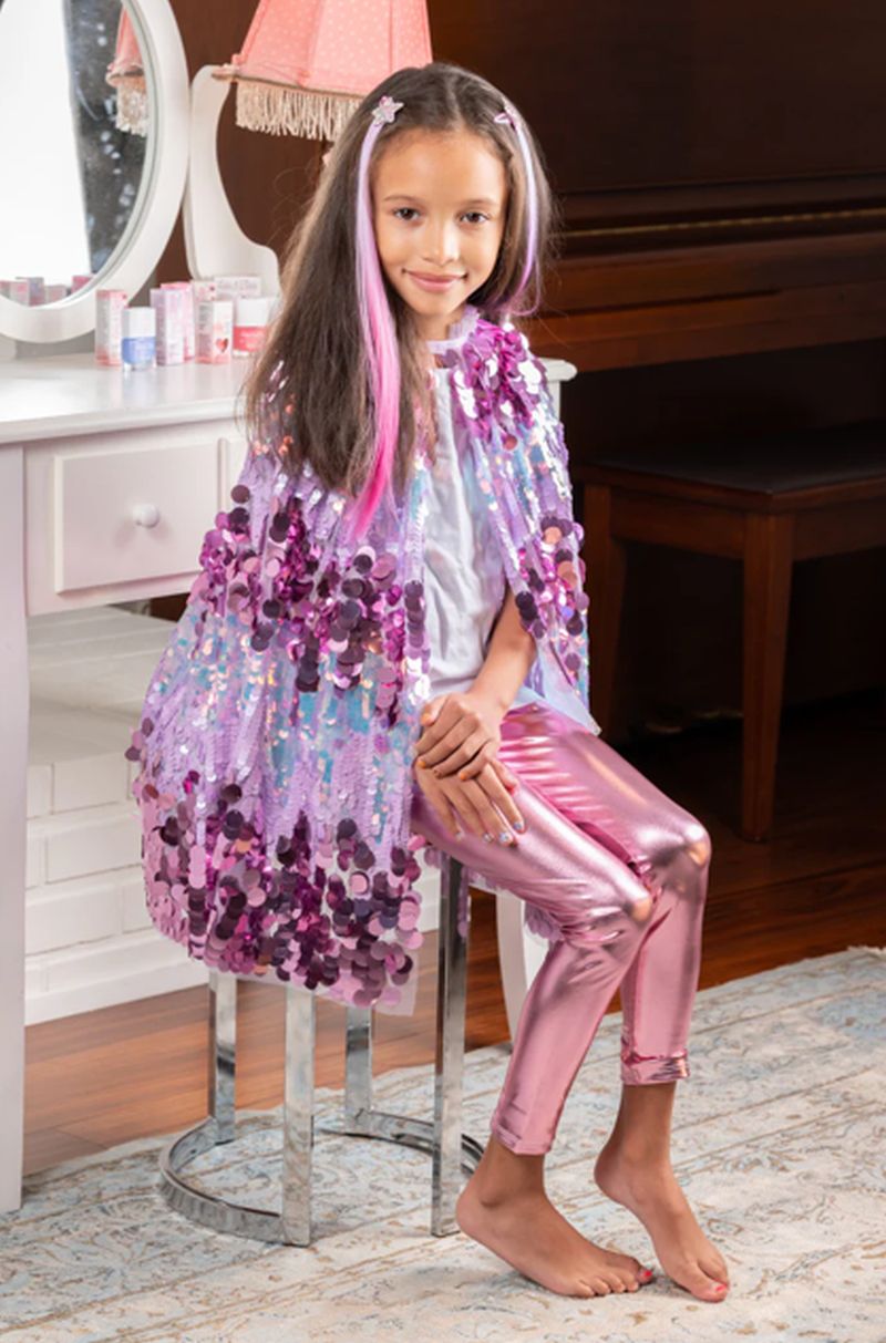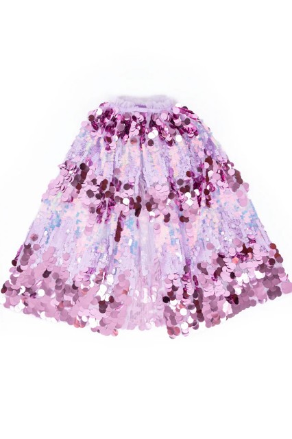 Questa splendida mantella è realizzata con un mix di paillettes grandi e piccole che si alternano in strisce audaci lungo tutta la lunghezza della mantella. Le paillettes scintillanti creano un effetto abbagliante a ogni movimento, aggiungendo un tocco magico a qualsiasi outfit. La mantella è rifinita con un delicato colletto in tulle, che aggiunge un tocco morbido ed elegante alle scintillanti paillettes. Una comoda chiusura in velcro sul collo garantisce una vestibilità sicura e confortevole. Che sia per un costume, uno spettacolo o semplicemente per aggiungere un tocco di glamour alle avventure quotidiane, questa mantella sarà perfetta in ogni occasione. Lavare in lavatrice a freddo con ciclo delicato, non candeggiare, asciugare all'aria, stirare a bassa temperatura.
