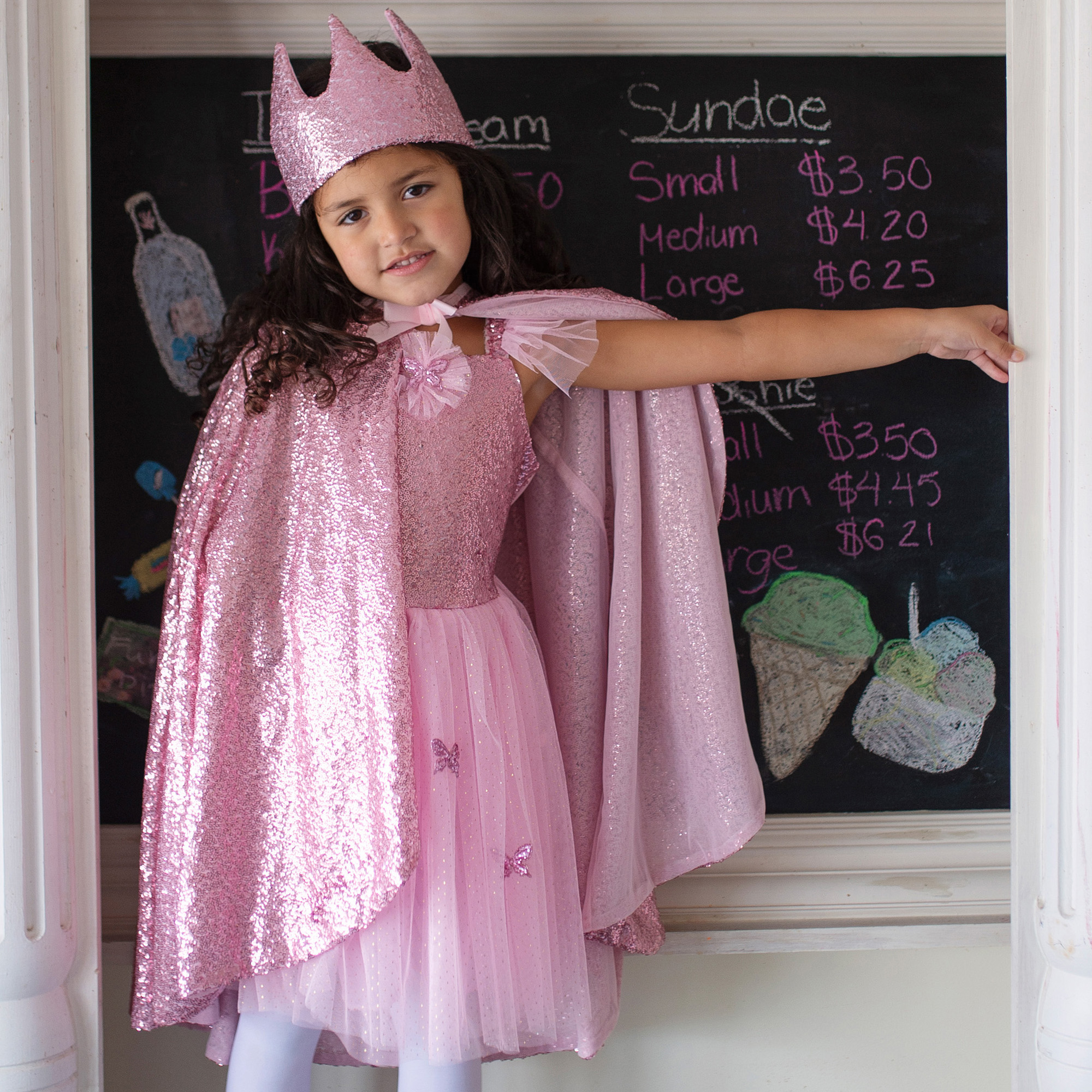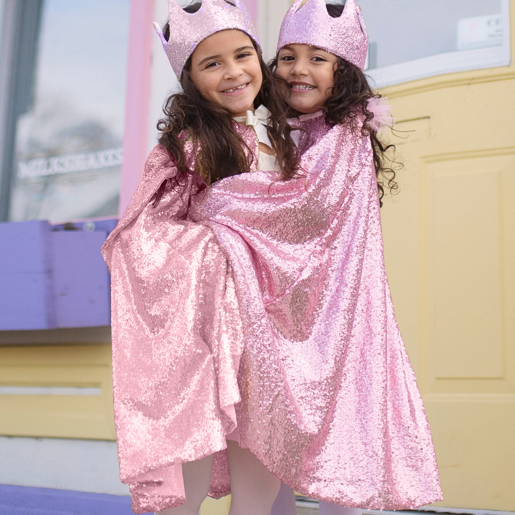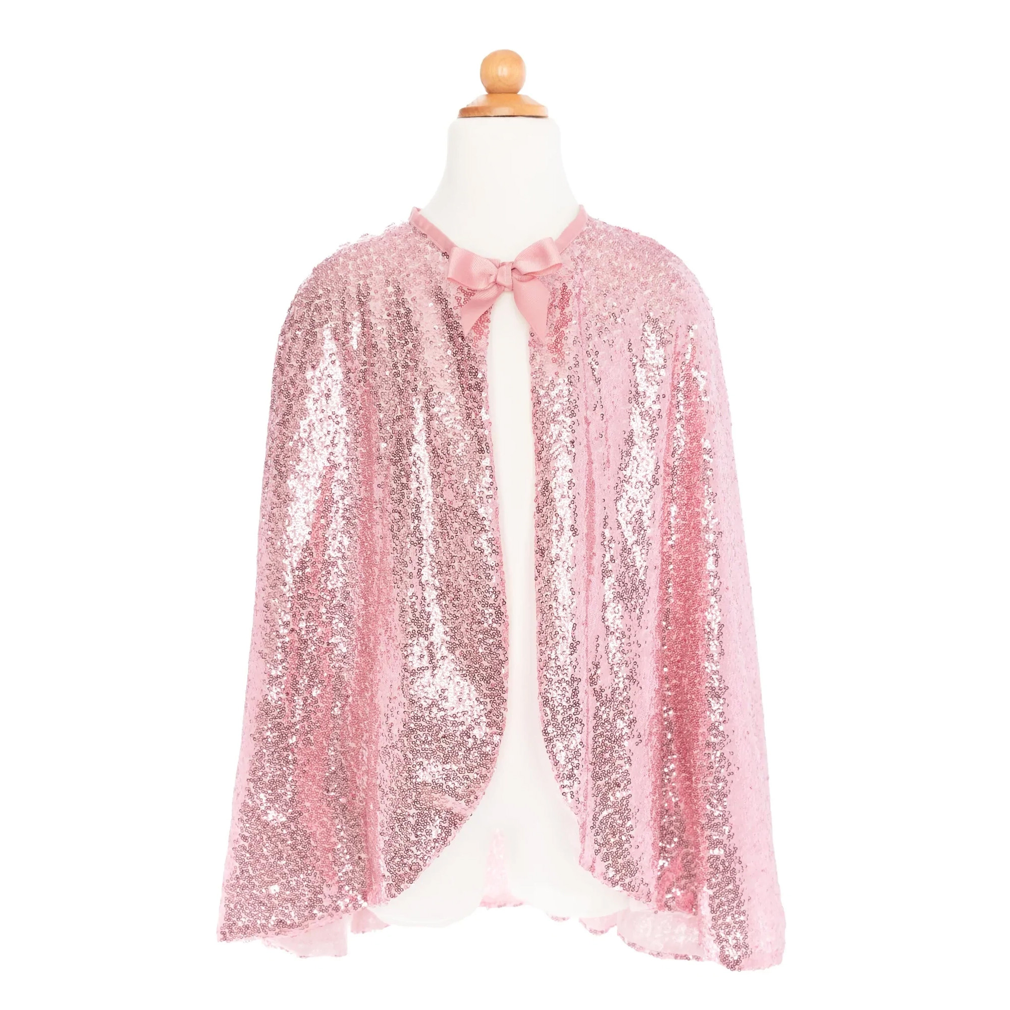 Questo scintillante mantello è realizzato con centinaia di paillettes di un caldo color rosa, che brilleranno a ogni movimento. E' foderato in morbida rete, mentre la comoda chiusura col velcro è nascosta da un elegante fiocco rosa. Il complemento ideale di ogni costume, perfetto per i bambini che amano giocare a travestirsi. E' lavabile in lavaterice. Taglia 5-6 anni.