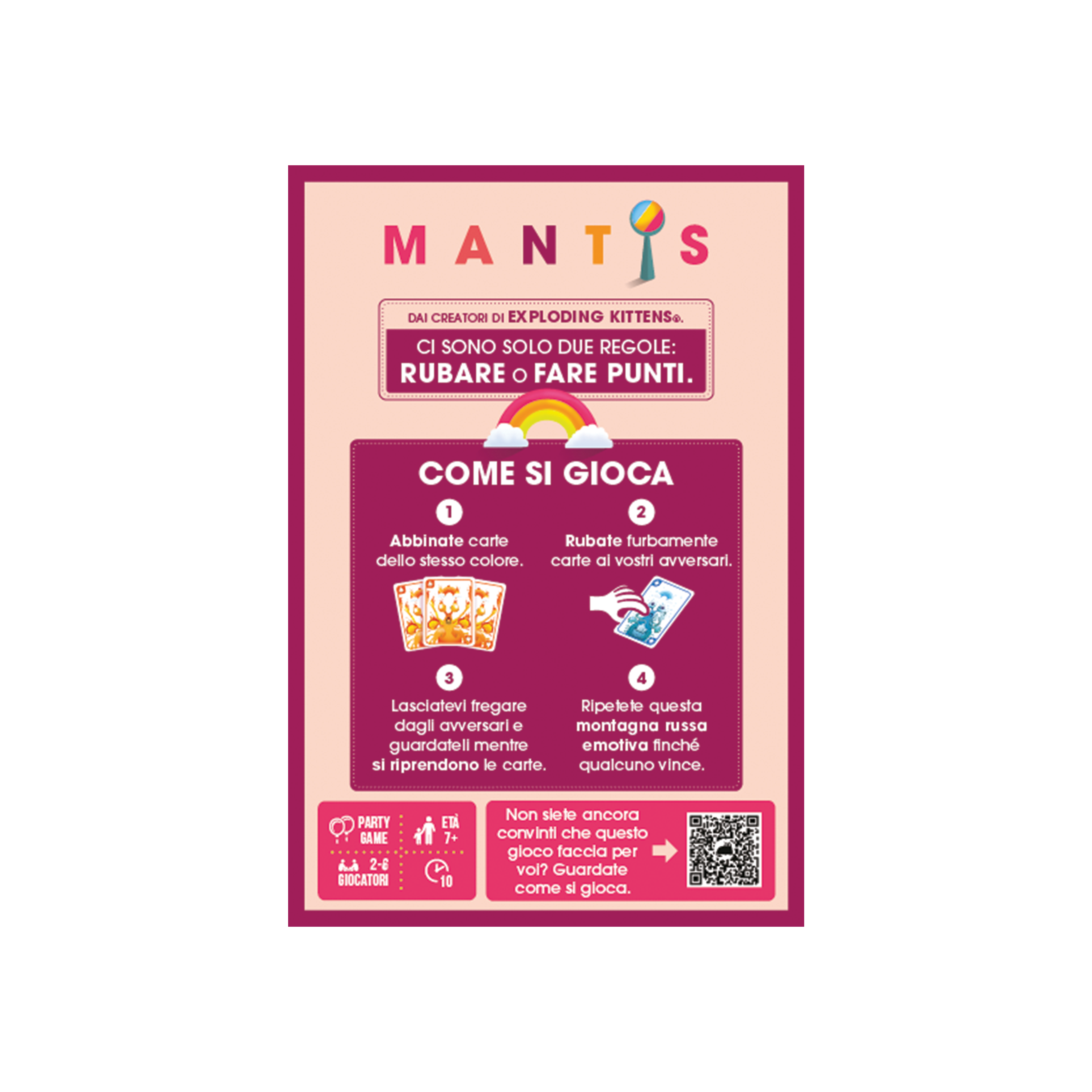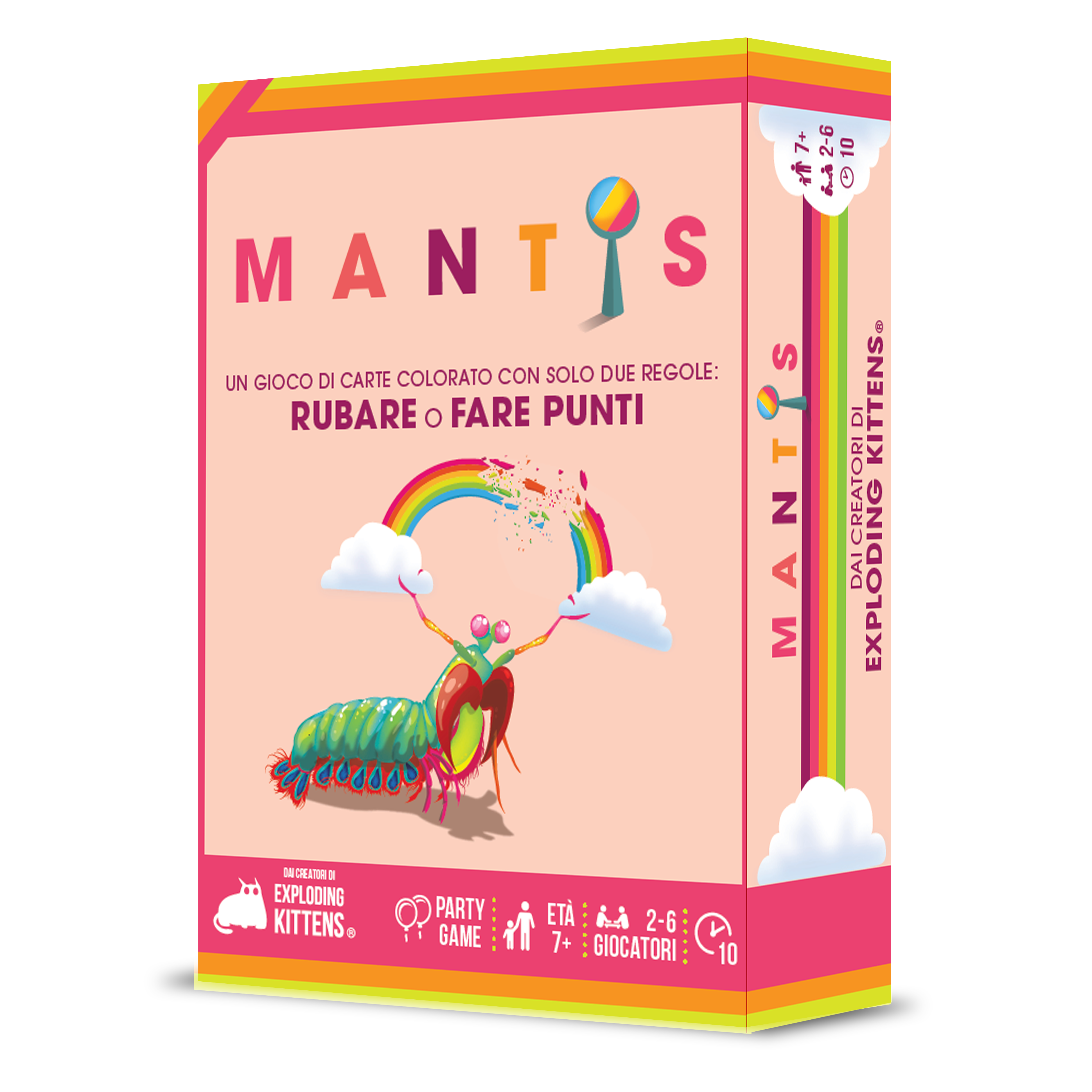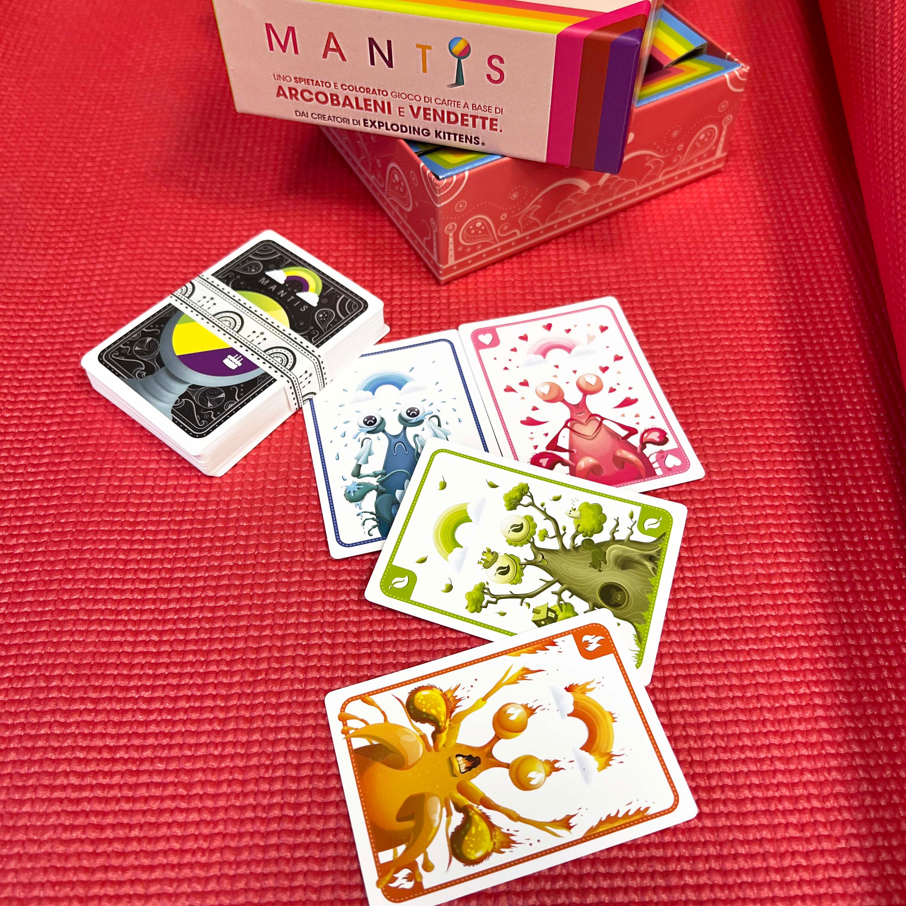 Dai creatori di Exploding Kittens un divertente party game senza esclusione di colpi. Un gioco capace di entusiasmare sia i giocatori più esperti che quelli alle prime armi, condito di cattiveria, sospetto e rancore. Con la sua semplicità e scorrevolezza di gioco, Mantis è pensato sia per ragazzi che per adulti. Regolamento semplice e immediato: rubate carte per abbinare i colori o fate punti! Per 2-6 giocatori, durata circa 10 minuti.