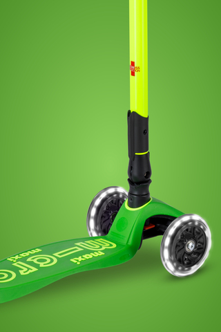 Vivaci colori neon e ruote a LED per questo monopattino dall'intuitivo meccanismo di chiusura che rende facile riporlo ovunque: in auto, sotto una sedia a scuola o in un armadietto.