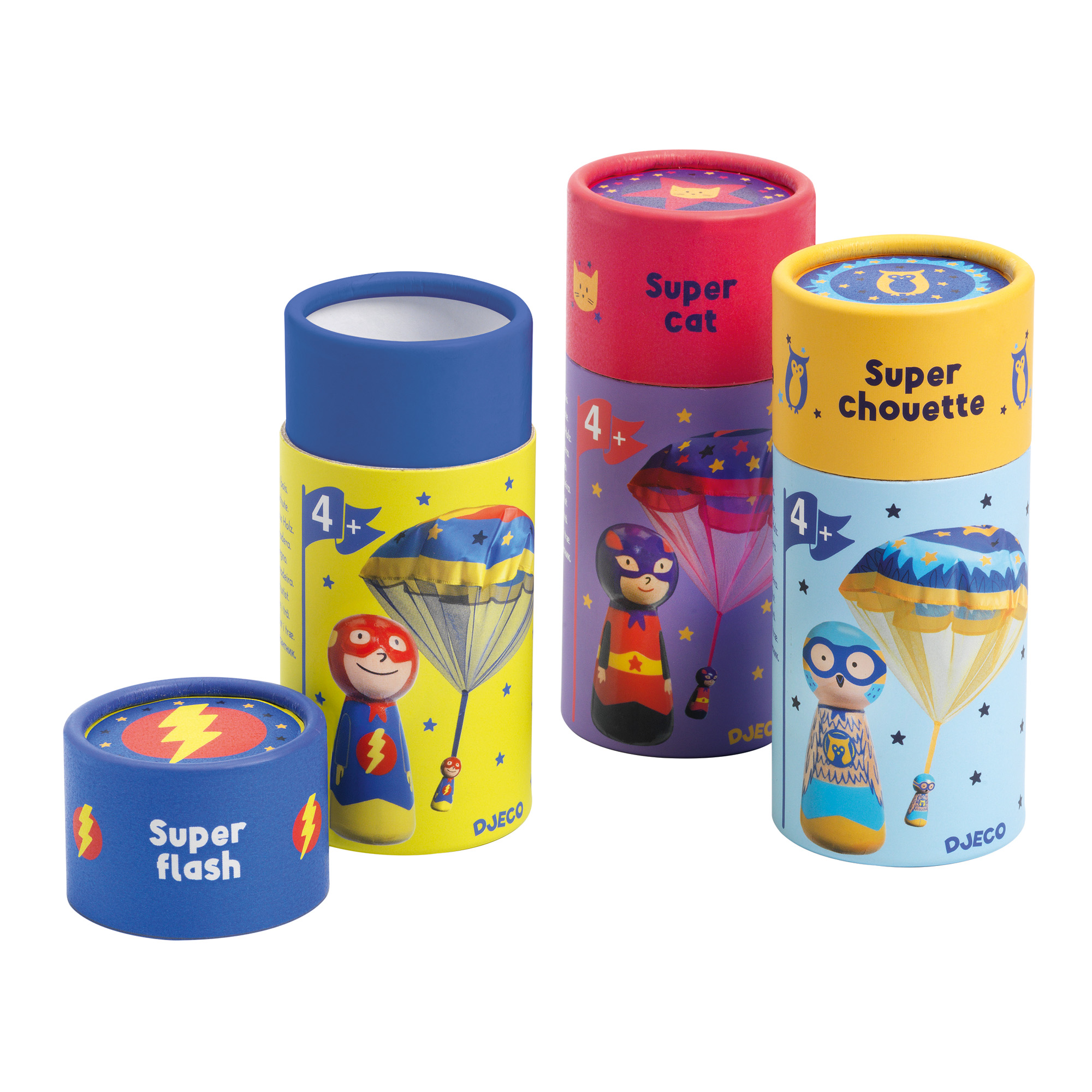 Piccoli, buffi paracadutisti in legno da lanciare e far fluttuare il più a lungo possibile. In 3 differenti modelli non selezionabili.