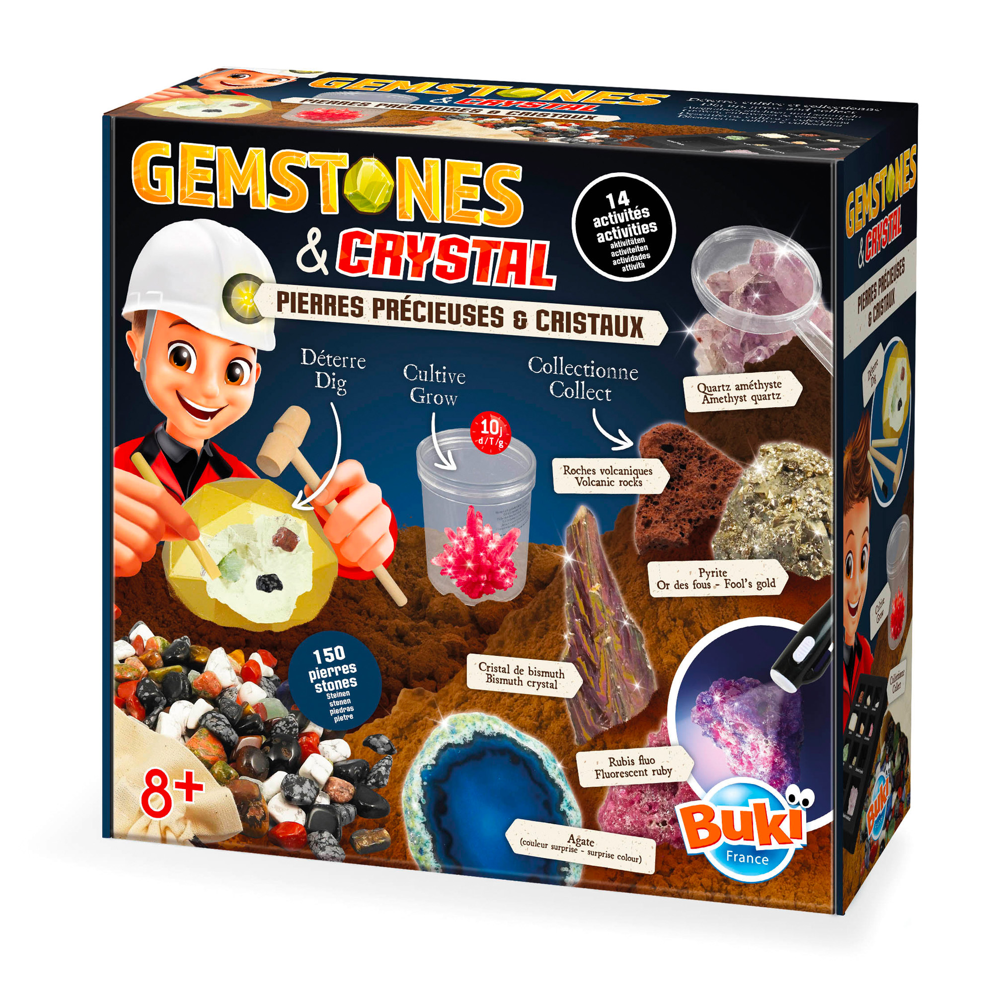 Il kit include 27 pietre vere per appassionarsi ai cristalli e alle pietre preziose. Si possono eseguire esperimenti per scoprirne le proprietà, utilizzare gli strumenti per estrarre 8 pietre vere grezze e confrontare con la lente d'ingrandimento le versioni lucidate nella busta (300 g). Si possono coltivare cristalli giganti e cristalli istantanei e studiare un'ampia varietà di rocce: pietre vulcaniche, quarzo, oro degli stolti, rocce fluorescenti, agata lucidata, cristallo di bismuto e molto altro. Foglio di istruzioni con illustrazioni a colori. Richiede 3 batterie LR41 (AG13), incluse.