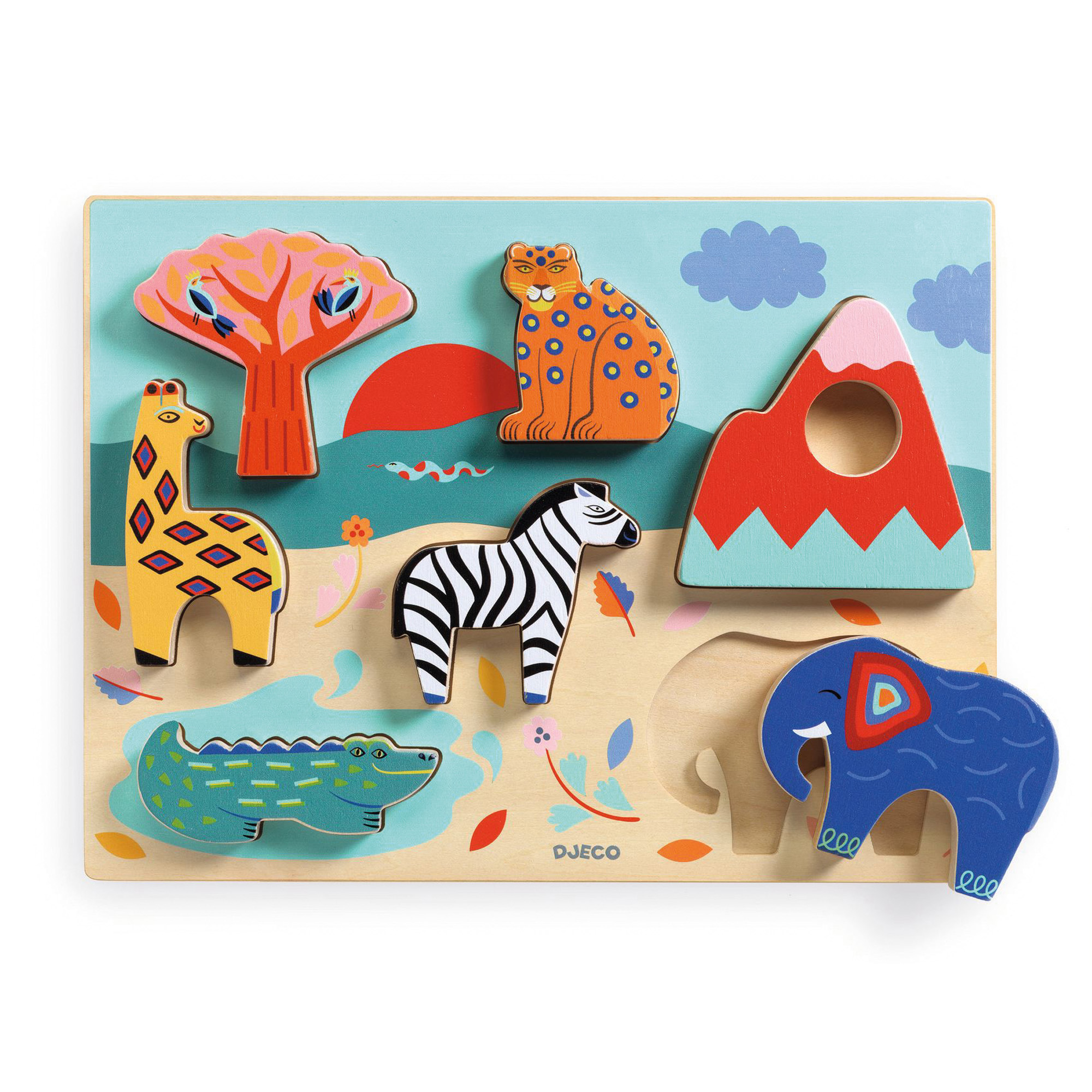 Un bel puzzle colorato, realizzato in legno FSC, nel quale gli animali e gli elementi del paesaggio sono grandi pezzi che possono essere utilizzati come figurine per giocare, oppure incastrati nella base del puzzle per completare l'ambientazione safari.