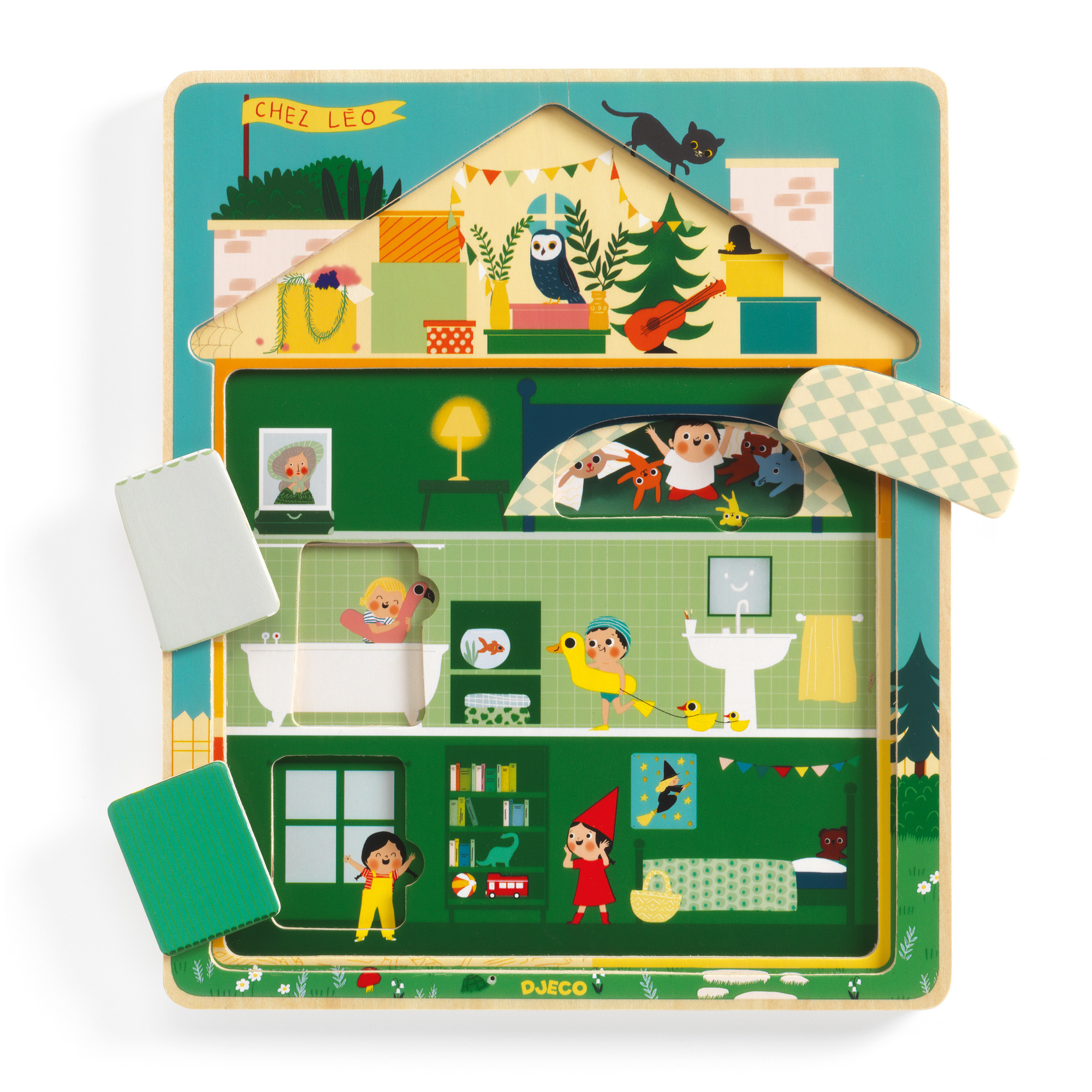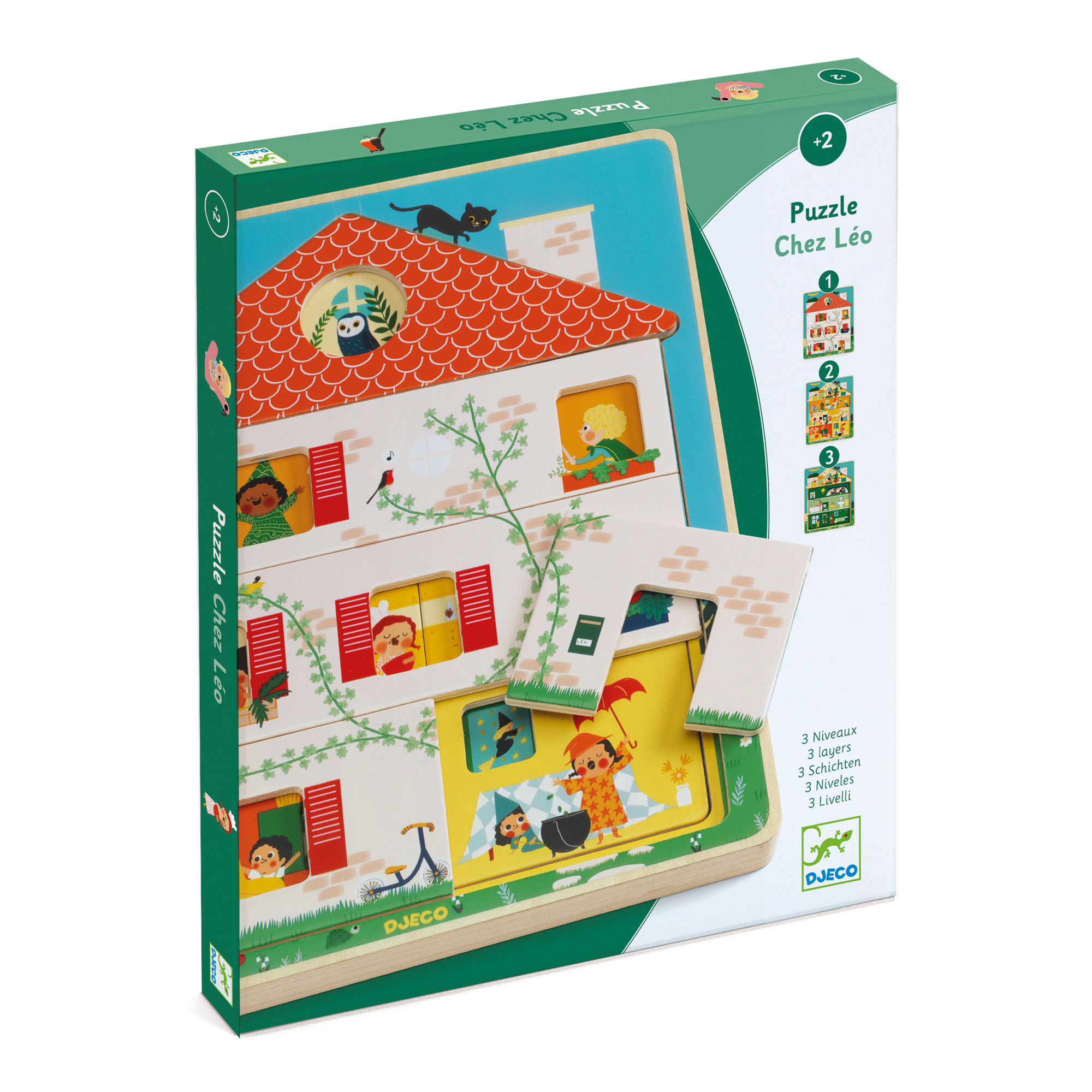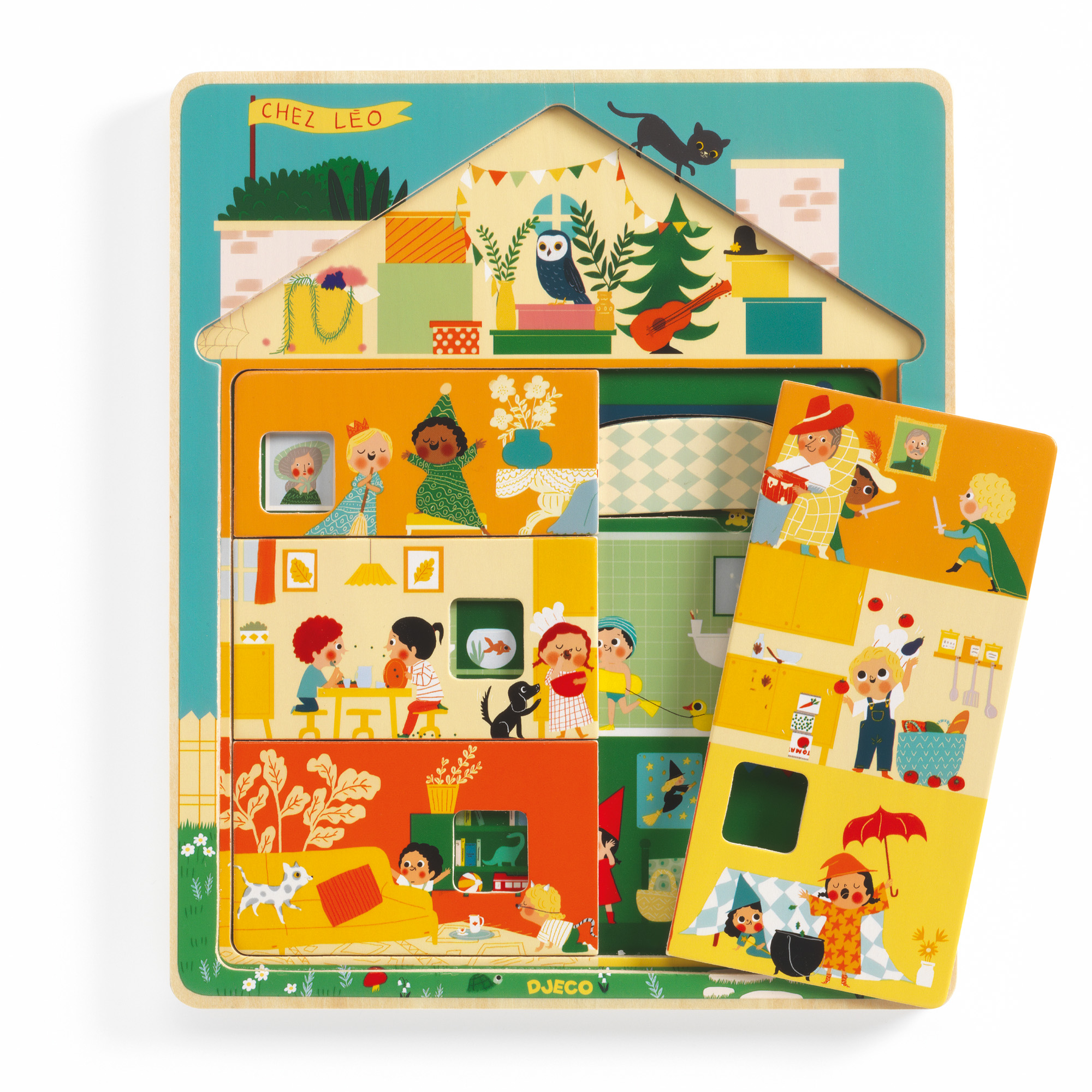 Puzzle a 3 livelli in legno composto da 12 pezzi. Ogni livello contiene un puzzle da comporre: man mano che si posizionano i pezzi si scopre la vita dei personaggi all'interno della casa. Continua