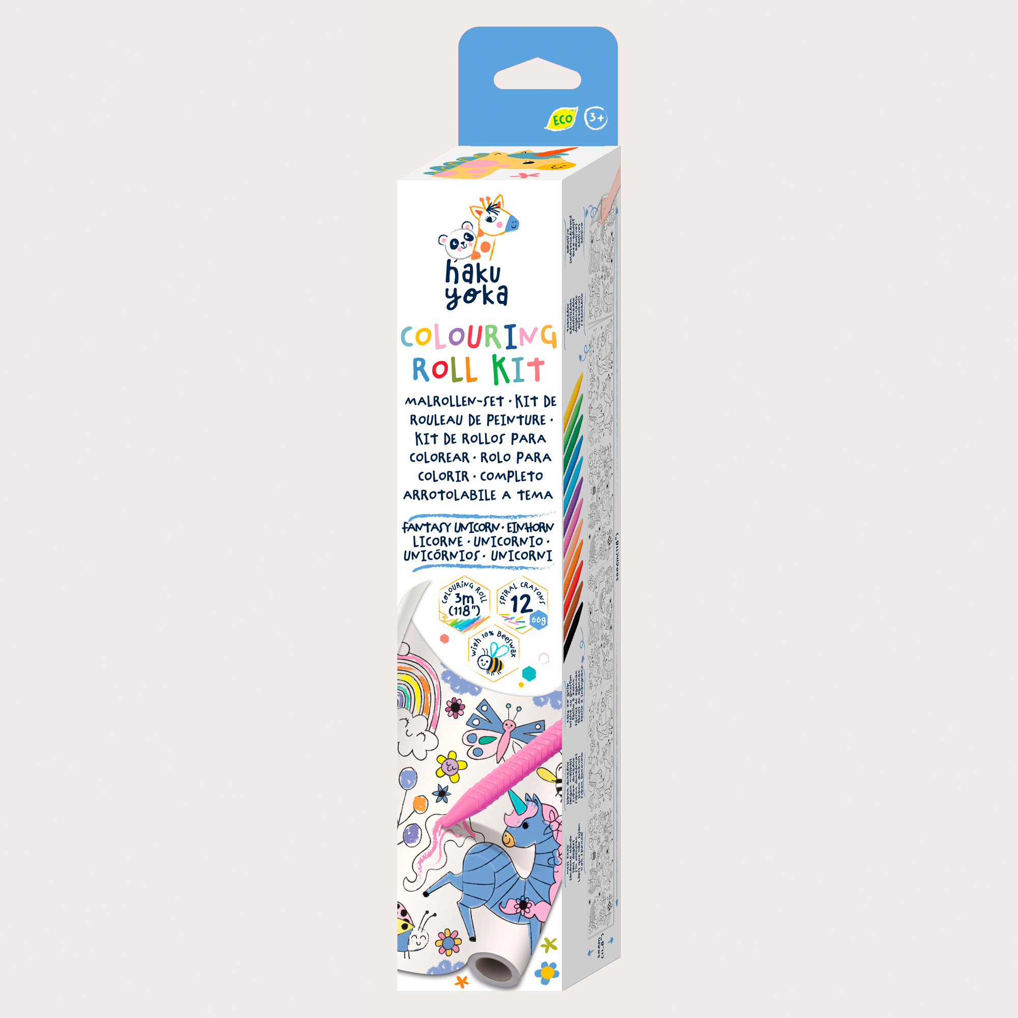 Il kit rotolo da colorare include un rotolo di carta adesiva lungo 3 metri pre-perforato ogni 50 cm e 12 pastelli a spirale in cera d’api. Grazie al retro adesivo, il rotolo si colora in modo semplice e pratico, e ogni disegno diventa una decorazione.
