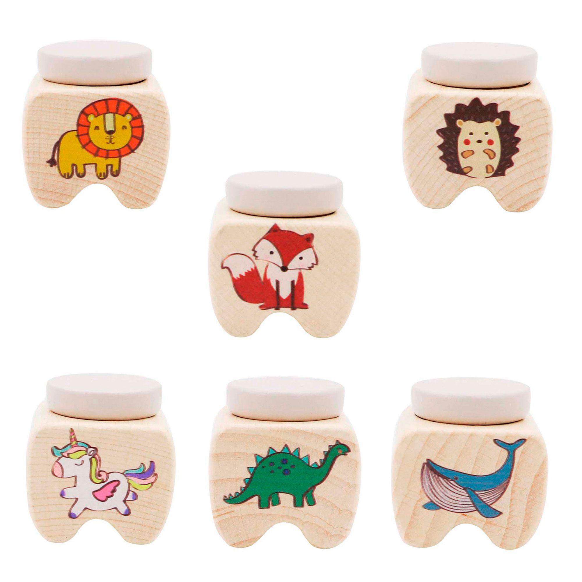 Originali scatole di piccole dimensioni in legno, dalla curiosa forma di dente, per conservare i primi dentini dei bambini. Soggetti assortiti non selezionabili. Continua