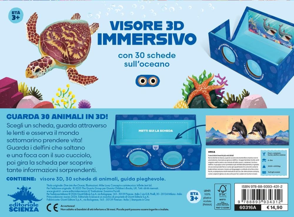 Scegli una scheda di un animale marino, inseriscila nella scatola, poi guarda attraverso le lenti e... preparati a tuffartinelle profondità dell’oceano! Vedrai il grande squalo bianco andarea caccia, la balenottera azzurra nuotaremaestosa e l’abilissimo polpo mimetizzarsi tra i coralli. Sul retro delle carte scopri informazioni sorprendenti, curiosità e due giochi di osservazione che metteranno alla prova i tuoi occhi da esploratore degli abissi.