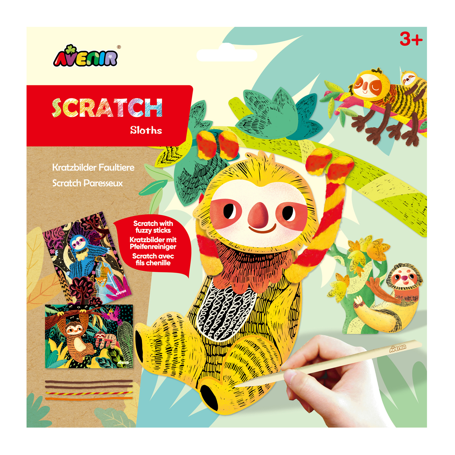 Un’attività creativa facile da realizzare, ma di grande effetto. È sufficiente grattare via la superficie scura con il bastoncino in dotazione per rivelare immagini dai colori brillanti e luminosi. All’attività scratch sulle schede sagomate si aggiungono piccoli elementi decorativi in ciniglia per un risultato piacevole e decorativo.