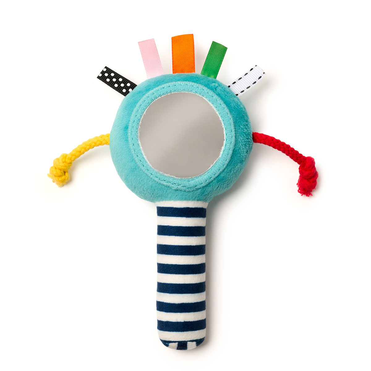 Sonaglio multi-texture, facile da afferrare: il suo manico in tessuto rigido a contrasto incoraggia il bambino a prenderlo in mano ed esplorare. I due specchietti e i cordini a ciascuna estremità catturano la sua attenzione, mentre il campanello premia ogni movimento con un suono delicato. Misura cm 15,5x8x4,5.