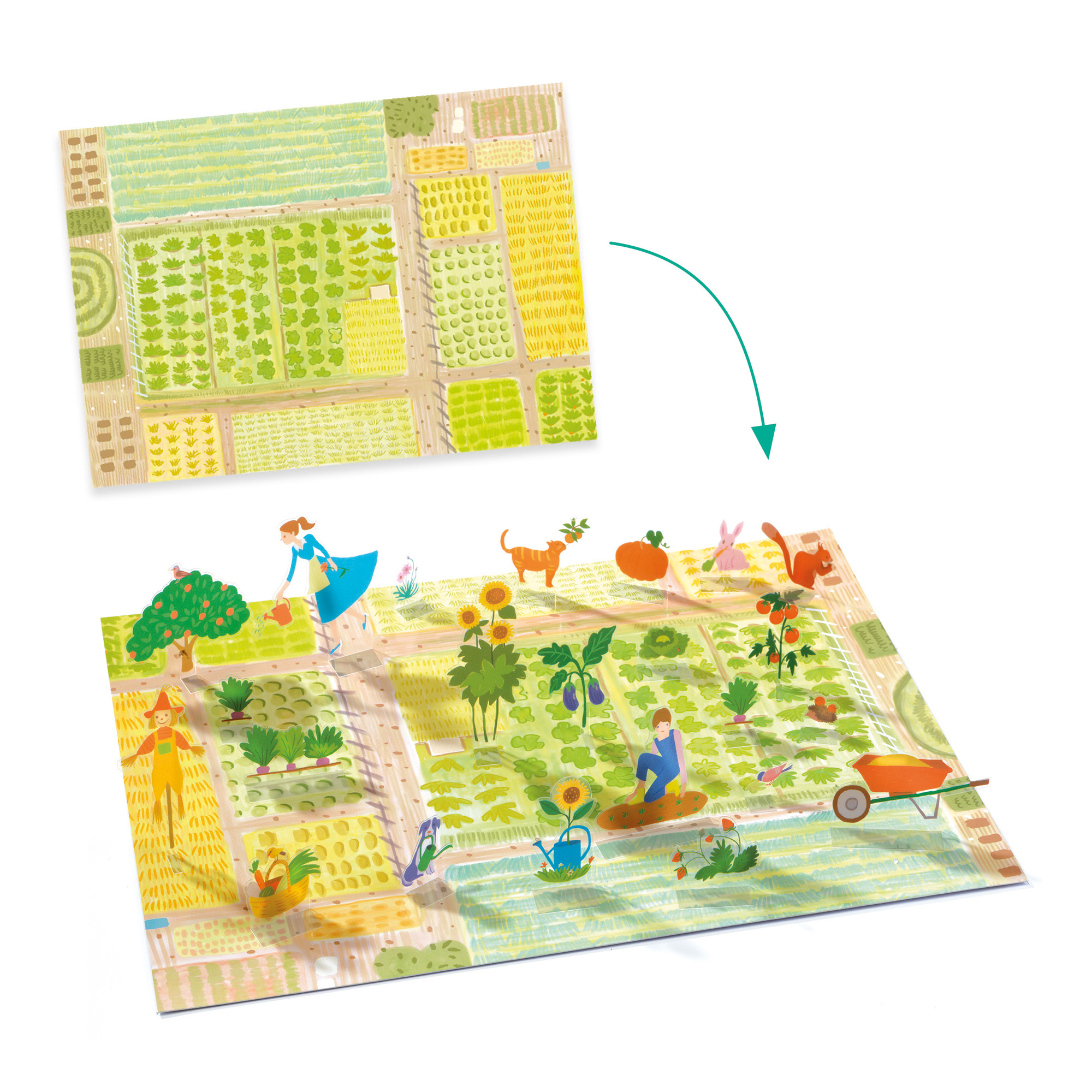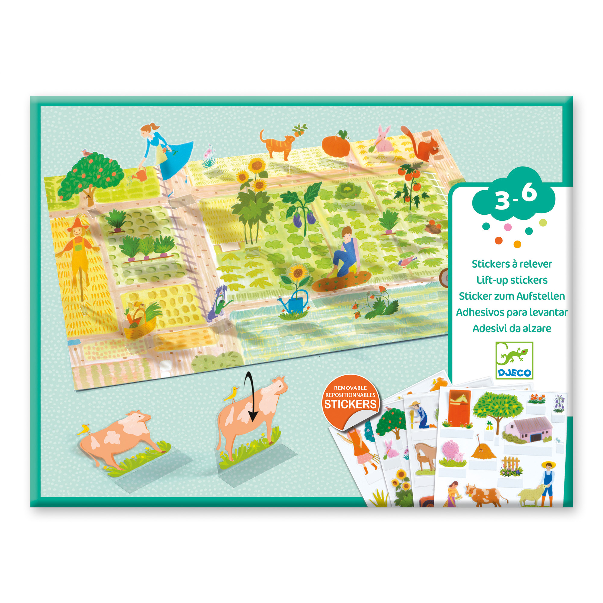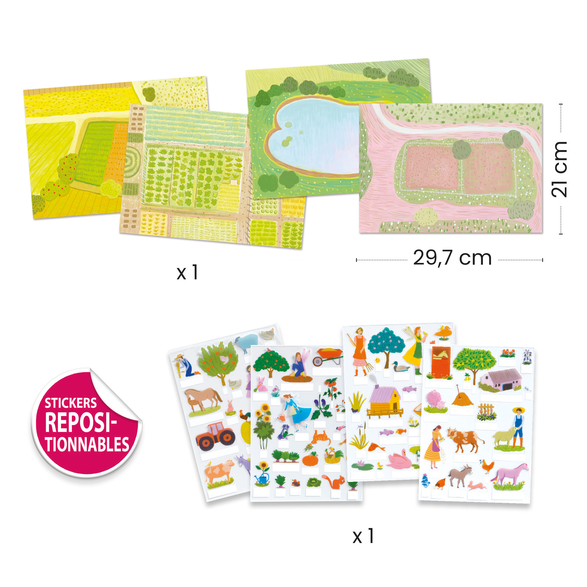 Quattro scenari su cui posizionare gli elementi rialzabili con basi adesive per animare la vita della fattoria. Gli adesivi sono facilmente riposizionabili, in modo da consentire di creare sempre nuovi scenari di gioco.