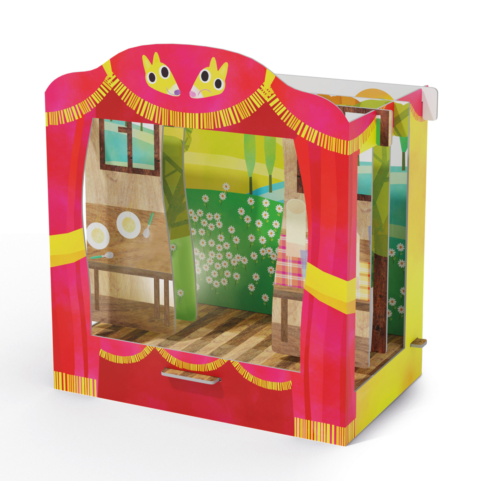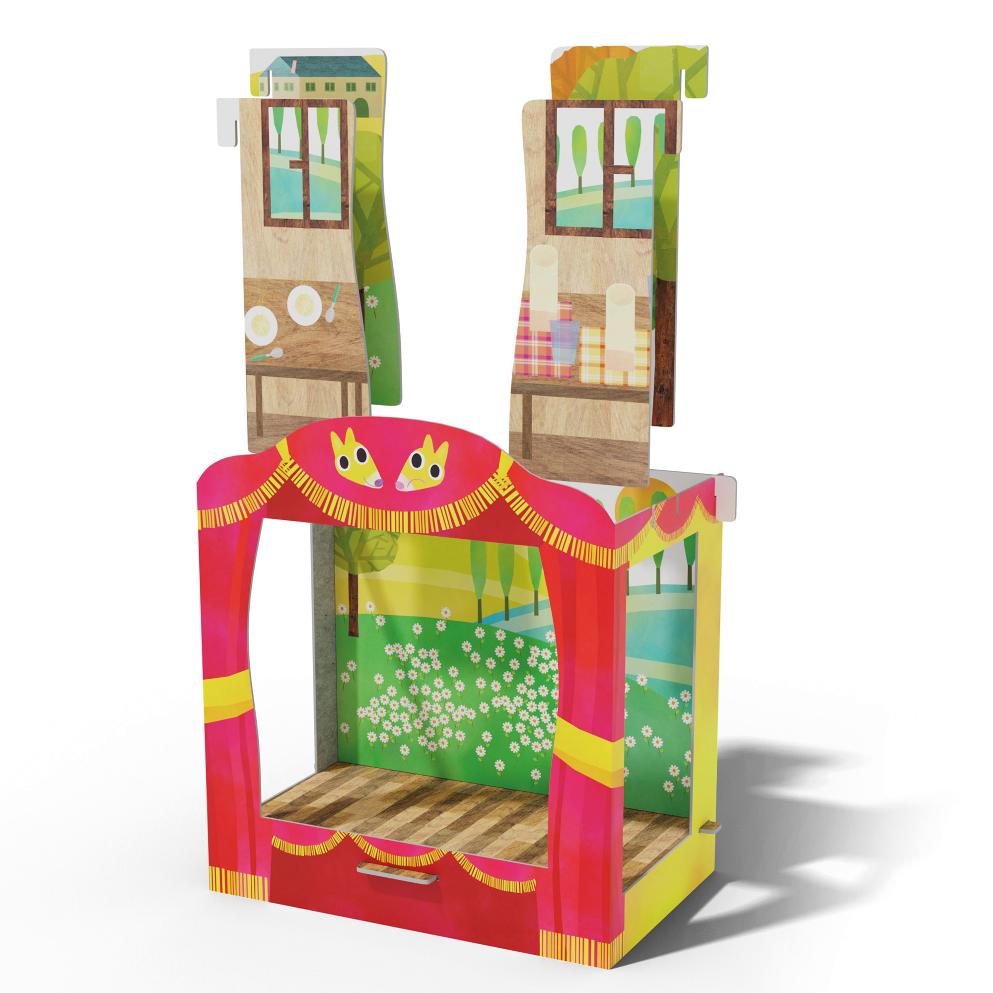 Un teatrino in cartone per mettere in scena le più belle fiabe classiche e giocare ad animarle con gli allegri personaggi inclusi. Il teatrino è dotato di 3 fondali diversi e 8 quinte laterali, entrambi double-face, per dar vita a favole sempre diverse. I coloratissimi personaggi inclusi sono 24 (12 figure double-face), da manovrare con le stecche di animazione. E' inclusa anche una guida di 32 pagine con i testi delle favole da portare in scena. I numerosi personaggi e i diversi allestimenti permetteranno ai bambini di ambientare non solo le fiabe classiche proposte ma anche tutto cui darà vita la loro fantasia.