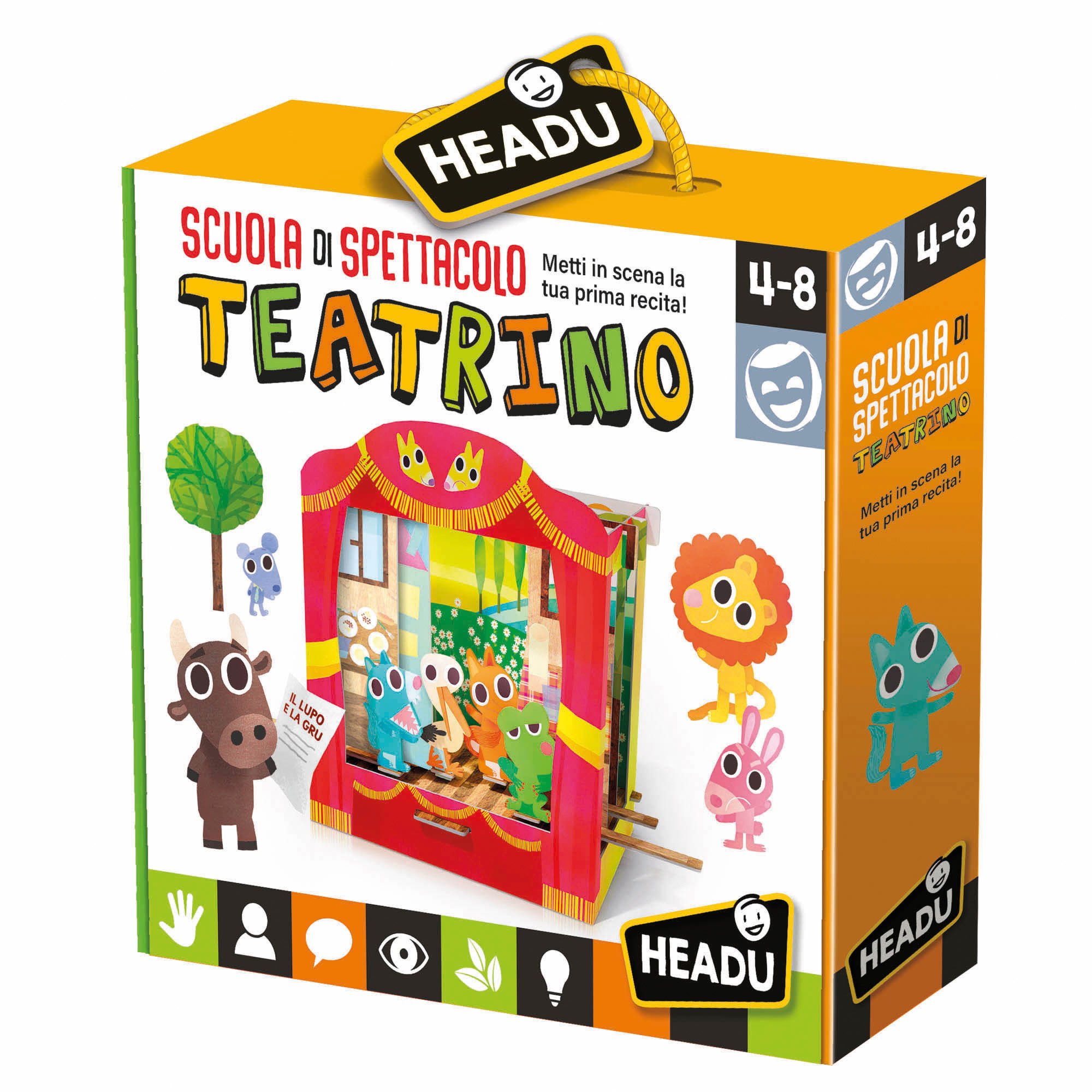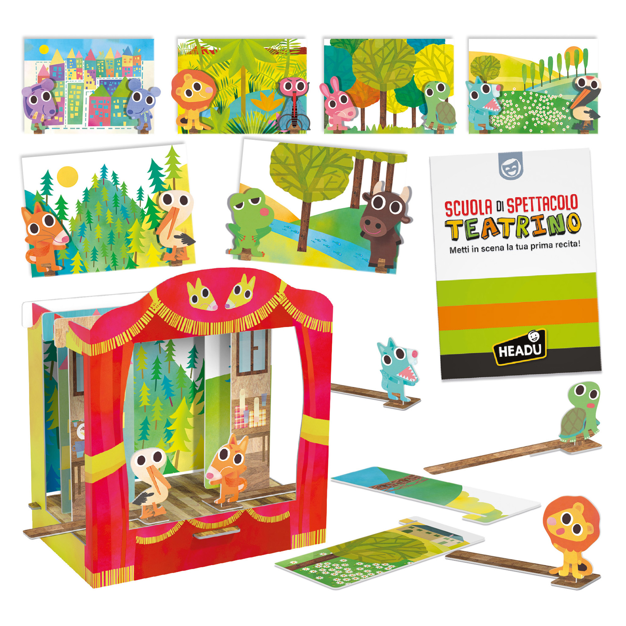 La confezione contiene: 1 teatrino in cartone, 3 fondali double-face, 8 quinte laterali double-face, 12 personaggi double-face, 12 stecche animazione, guida didattica.