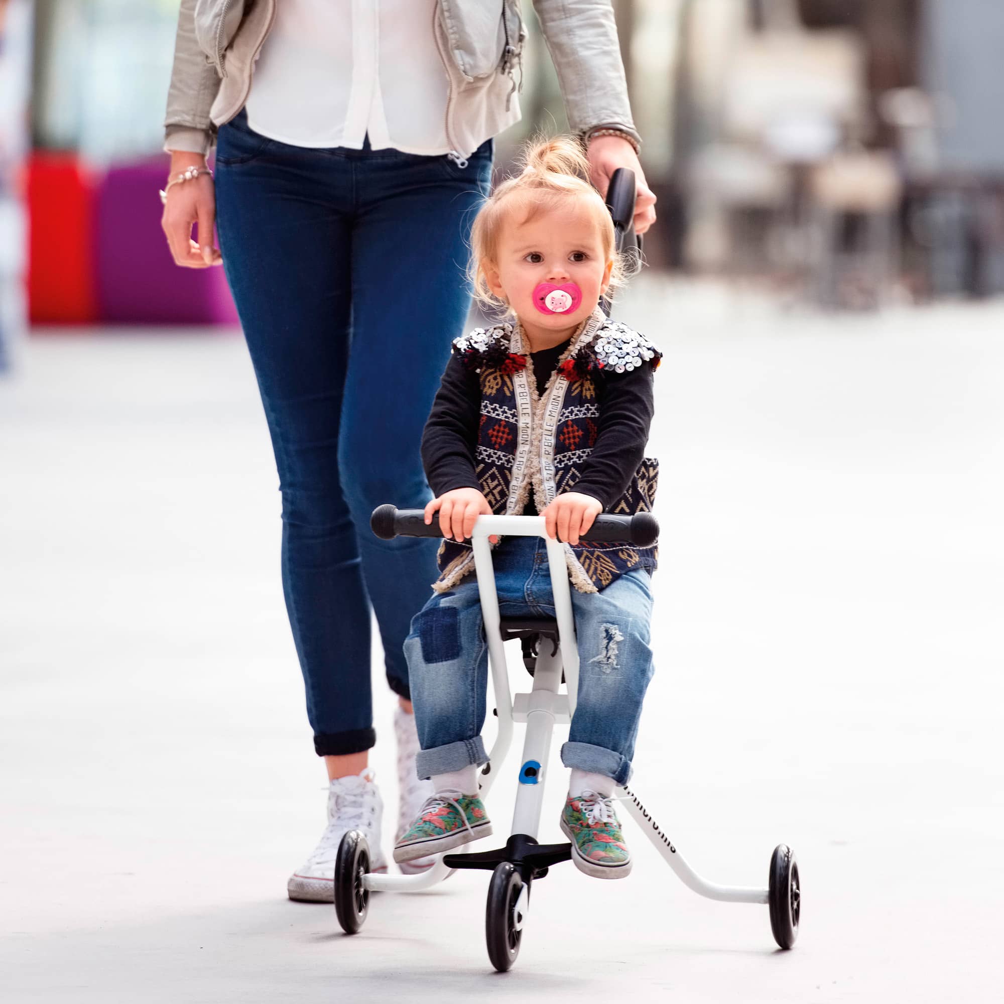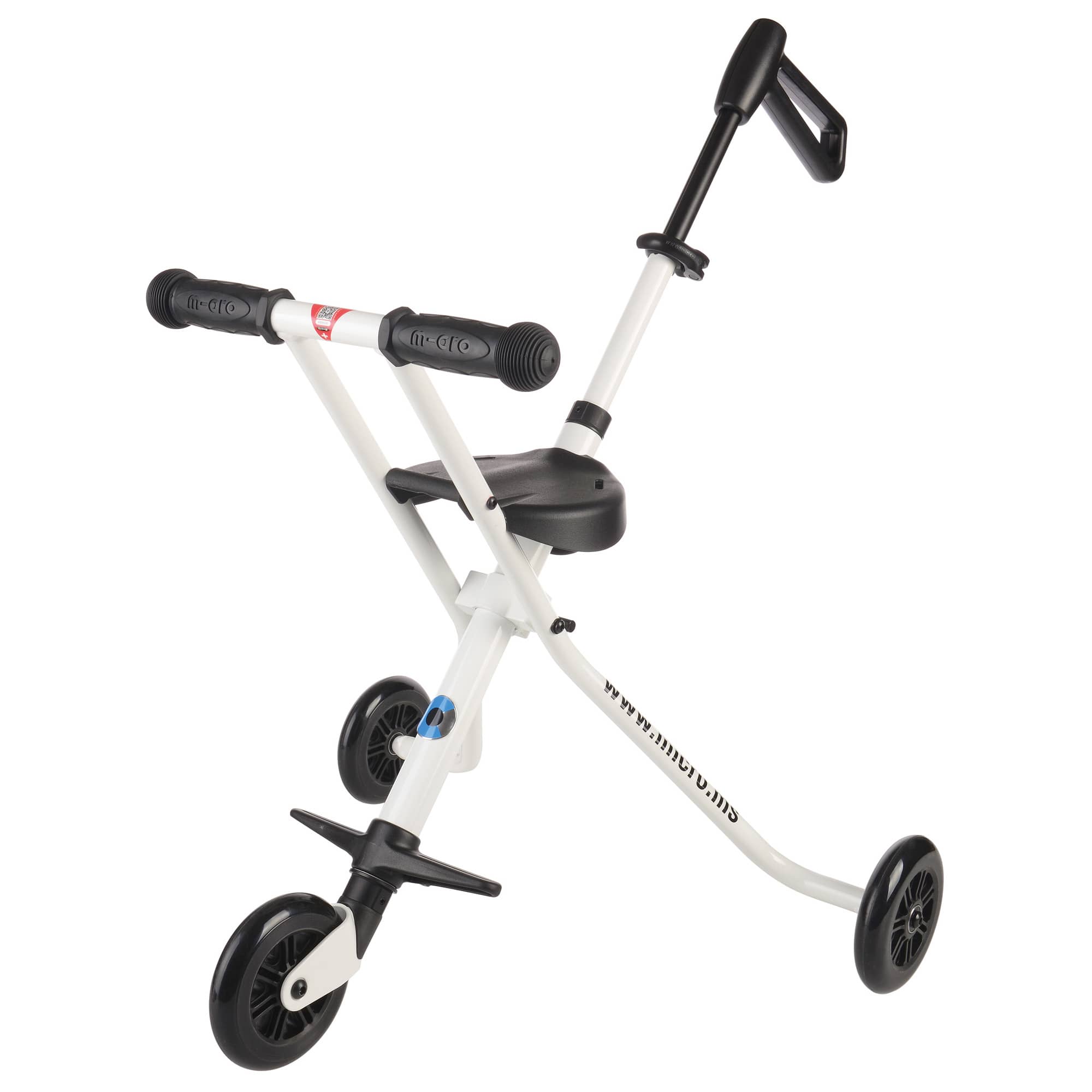 Dimenticati il passeggino, pesante, ingombrante, scomodo. Il triciclo Micro è pieghevole, compatto, semplice da utilizzare. Per fare shopping o per passeggiare in città, il triciclo Micro diventa il mezzo ideale per spostarti facilmente e efficacemente con il bambino al seguito. Leggero e pieghevole, viene in aiuto dei bambini che non vogliono più camminare: un sorriso immediato. Se il bambino vuole camminare, il triciclo si ripiega, si appende al carrello, si infila in uno zaino o si rimette nel bagagliaio. La barra da spinta è telescopica e si adatta a diverse lunghezze. Peso 2,25 kg. Portata 20 kg.