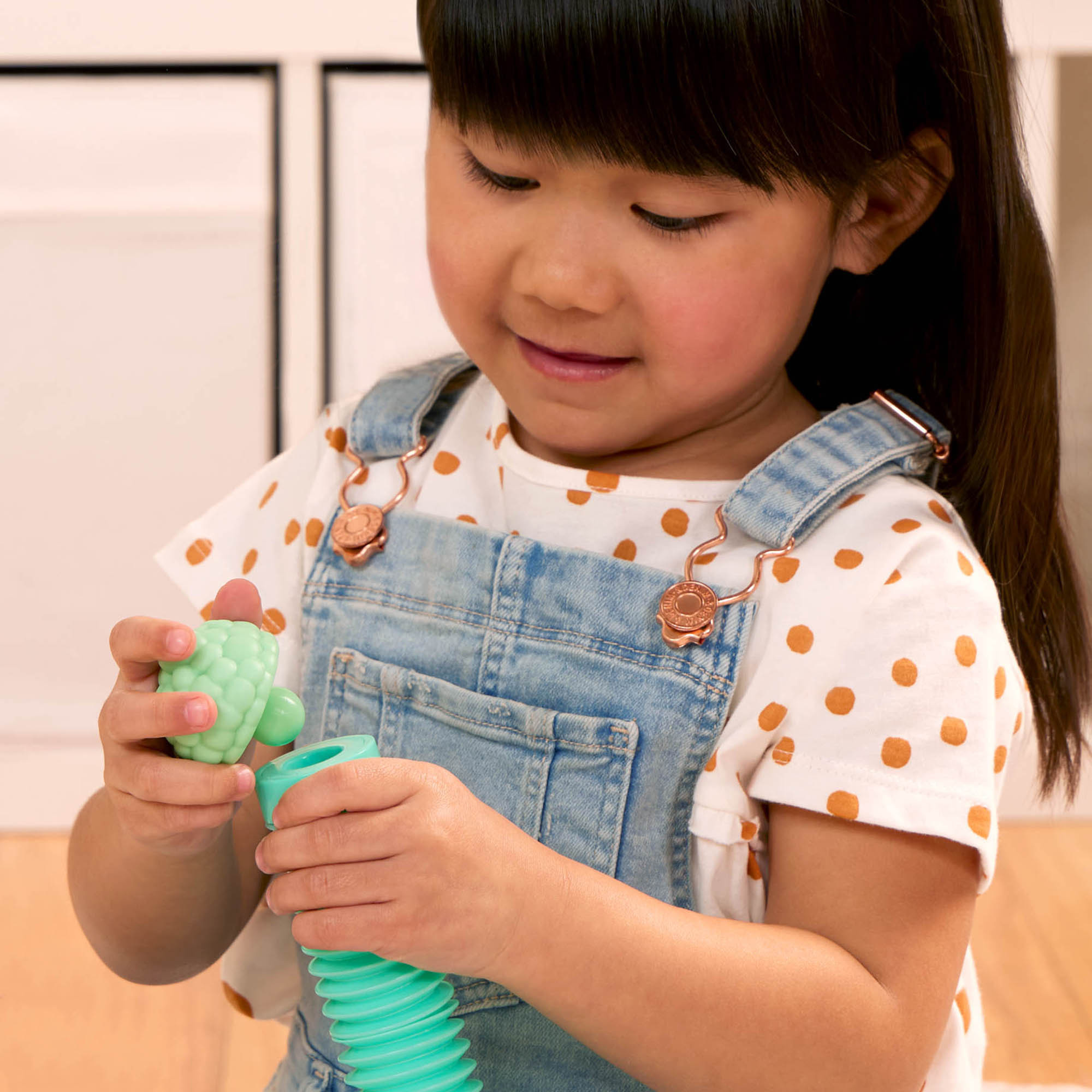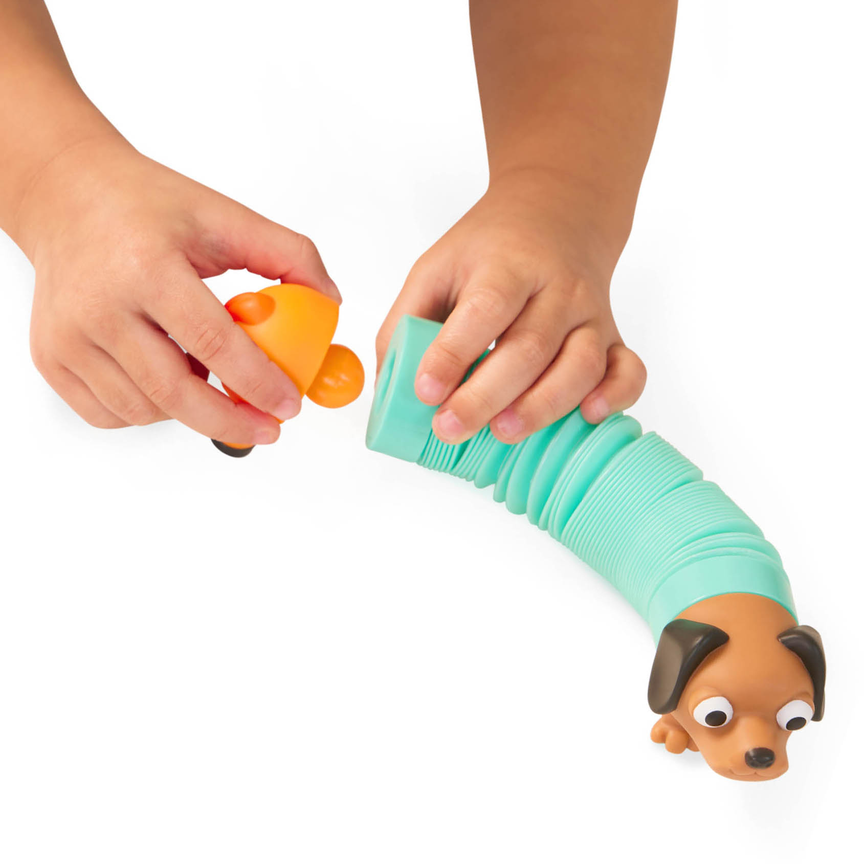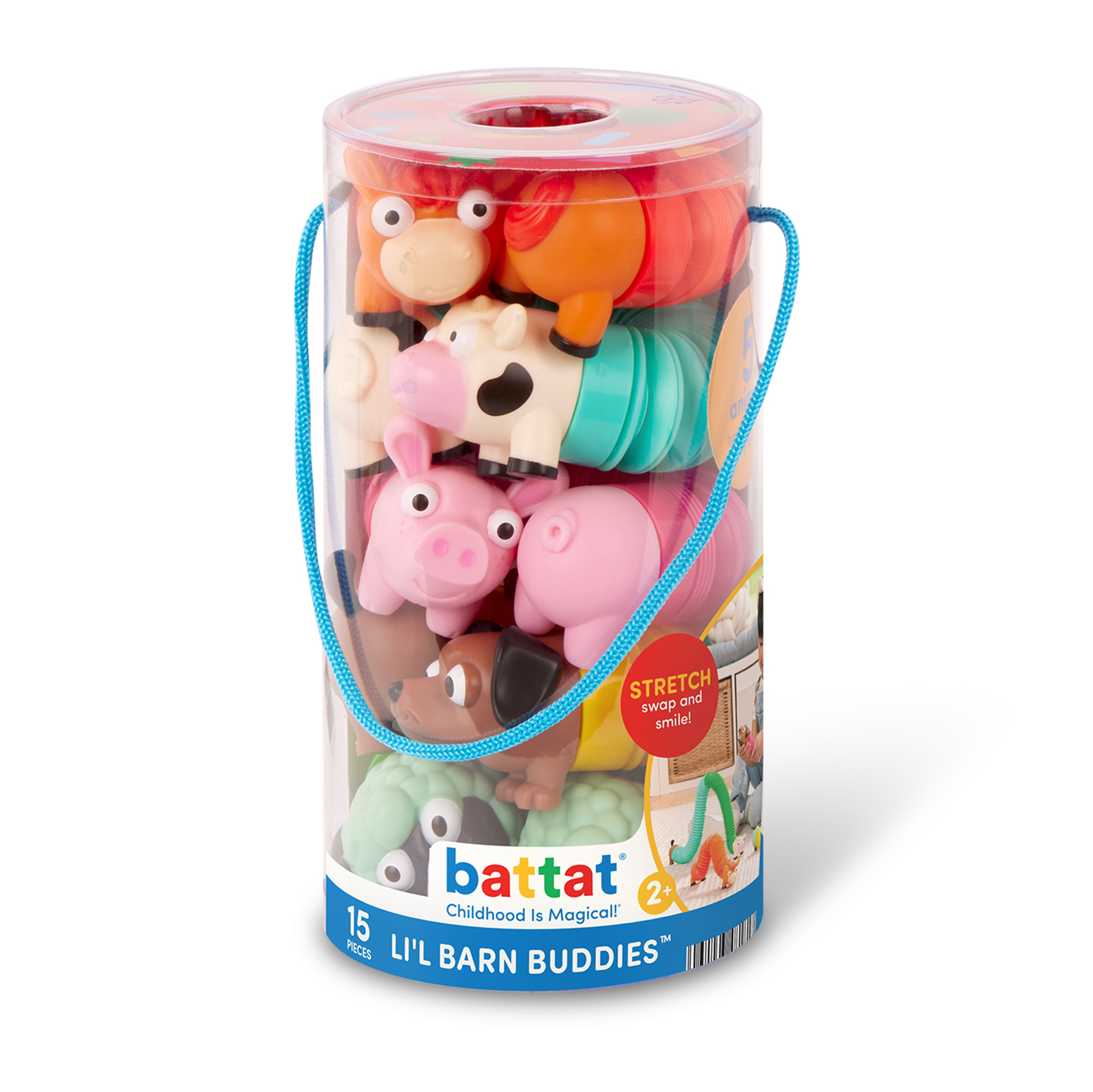 I tubi sensoriali mix and match compongono un set da 15 pezzi con cinque animali della fattoria: cavallo, mucca, pecora, cane e maiale. Ogni animale è composto da una testa, un tubo a fisarmonica colorato e una base intercambiabile. I pezzi possono essere mescolati tra loro per creare combinazioni sempre diverse. Il gioco favorisce lo sviluppo sensoriale, la motricità fine e la creatività. Il formato compatto lo rende adatto anche all'uso durante i viaggi.