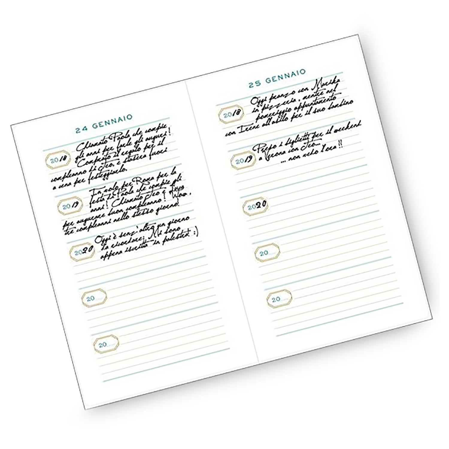 In ogni pagina di questo diario dei ricordi c'è spazio per annotare i fatti accaduti lo stesso giorno nell'arco di cinque anni. Via via che le pagine si riempiono, si scoprono curiose coincidenze e si rivivono momenti dimenticati, aggiungendo una gioia imprevista a tutte le giornate. Come usare questo diario: si Apre la pagina con la data odierna, e si inserisce l’anno come prima voce. Poi si scrivono i pensieri sugli eventi del giorno. L’indomani, si passa alla nuova pagina e si completa la data. Si continua così per tutto l’anno. Quando sarà finito, si inserisce l’anno nuovo come seconda voce della pagina relativa, e si prosegue così per tutti gli anni rimanenti. Con un segnalibro per passare facilmente alla pagina giusta, questo diario diventerà un piccolo tesoro con il passare degli anni, e sarà un dono prezioso per le generazioni che seguiranno. Una nota al giorno è il regalo perfetto per chi incomincia un nuovo percorso nella vita o per i rituali quotidiani.