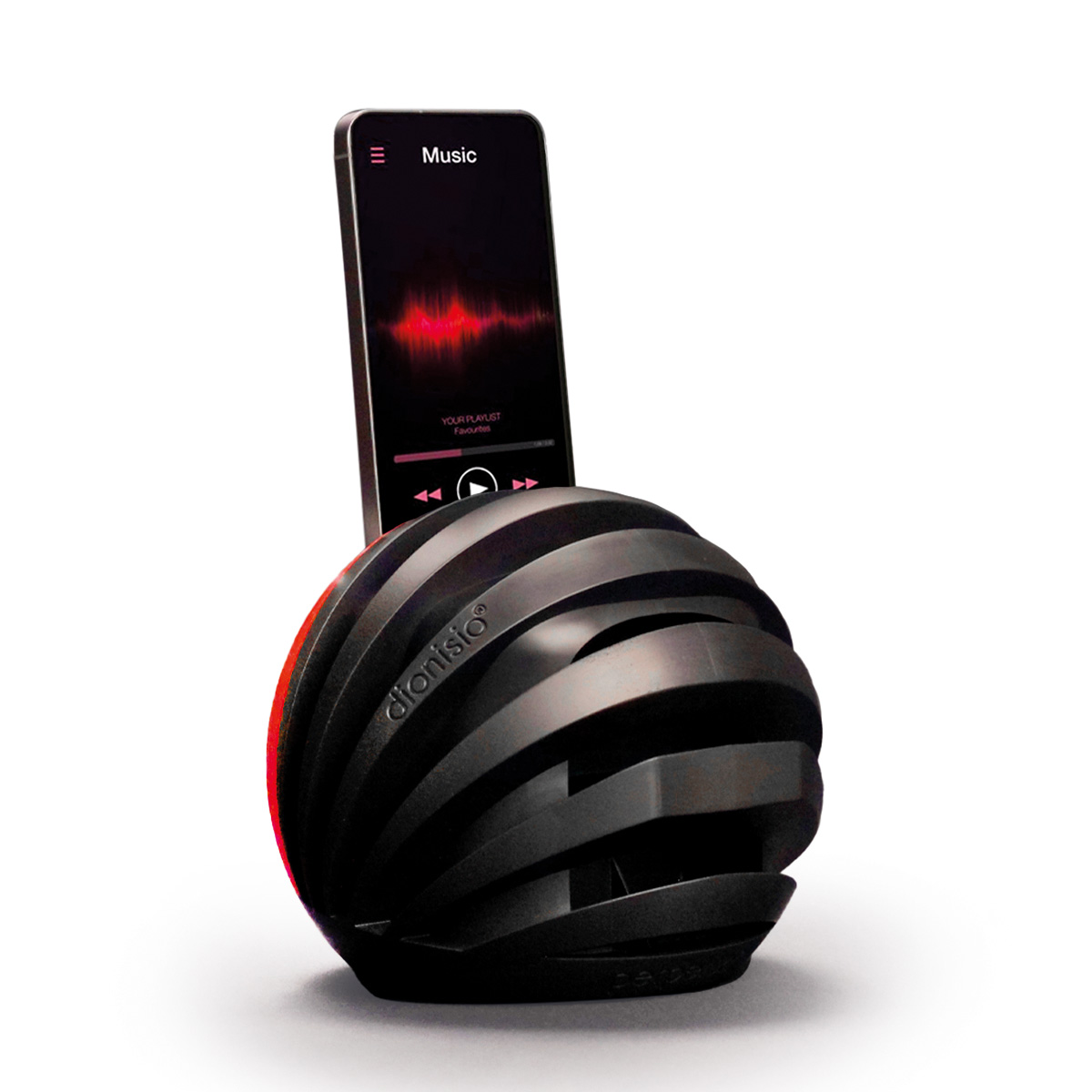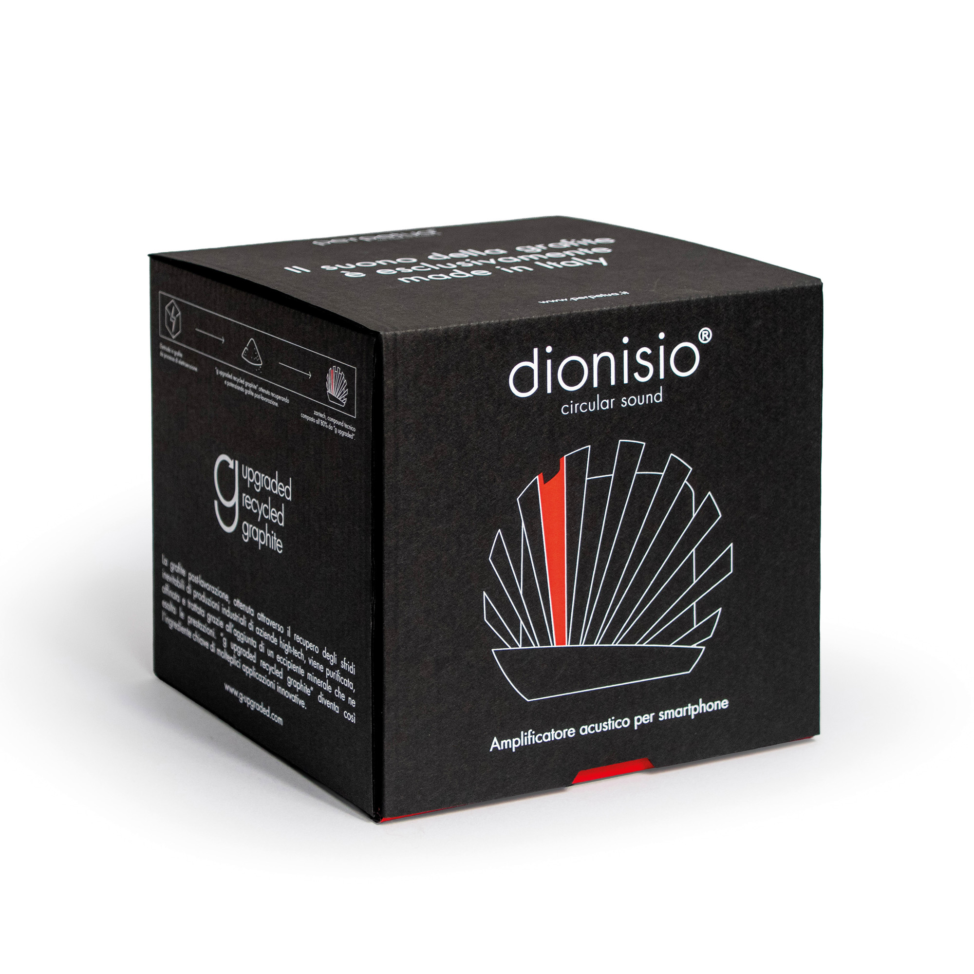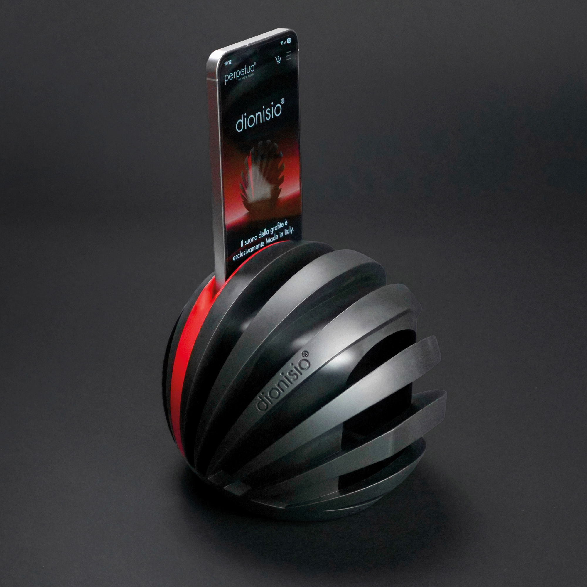Diffusore acustico per smartphone in zantech, compound tecnico a base di “g_upgraded recycled graphite”, dionisio è composto di 3 moduli assemblati senza utilizzo di collanti. É progettato per alloggiare smartphone fino a 13 mm di spessore e 84 mm di larghezza. La progettazione del condotto interno è ispirata ad un sofisticato sistema ibrido che combina i principi della tromba retroattiva e del bass reflex. Questa soluzione permette di ottenere una riproduzione sonora non solo amplificata, ma anche uniforme e fedele all'originale su tutto lo spettro sonoro, garantendo un'esperienza d'ascolto avvolgente, immersiva e di qualità. È possibile inserire lo smartphone in dionisio anche mentre è in carica.